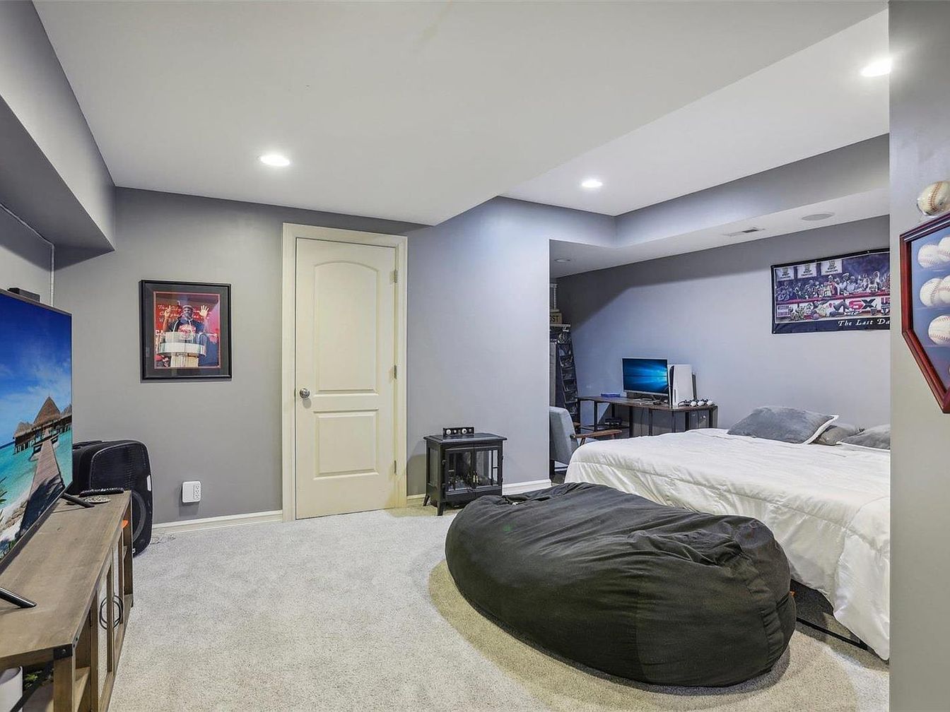 This cozy basement area combines a bedroom and a small home office, creating a multifunctional living space. The walls are painted in a calming gray tone, while the neutral light carpet softens the room’s atmosphere. A large, white bed with fluffy pillows sits tucked into a corner, next to a simple black bean bag chair offering casual seating. Recessed lighting in the ceiling provides ample brightness. A compact desk with a computer setup anchors the workspace. Decorative touches include framed sports memorabilia and personal photos on the walls, adding character and warmth to the space.