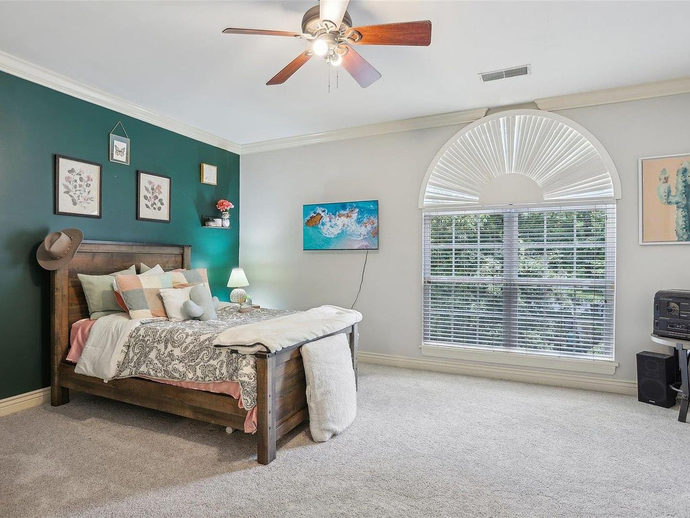 This bedroom features a cozy layout centered around a wooden bed frame set against a deep green accent wall. The bedding combines soft neutral tones with patterned textures, adding warmth and depth. The opposite wall is painted a light neutral shade, balancing the darker accent. A large arched window with white blinds floods the room with natural light, enhancing the spacious feel. The ceiling fan with wooden blades complements the earth tones of the furniture. Delicate wall art and a small shelf with decor add a personalized, inviting touch to this restful space.
