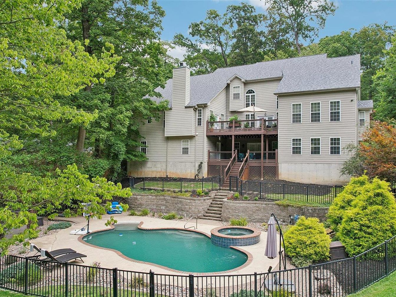 This spacious backyard offers a serene retreat with a freeform swimming pool complemented by an attached circular hot tub, creating a perfect oasis for relaxation. The pool is surrounded by a concrete deck with lounge chairs positioned for sunbathing and a basketball hoop for recreational fun. A black metal fence encloses the pool area for safety. Steps lead up to a raised patio and deck connected to the house, featuring wood railings and an outdoor umbrella providing shade. Lush greenery and tall trees encircle the yard, adding privacy and a natural ambiance to the peaceful setting.