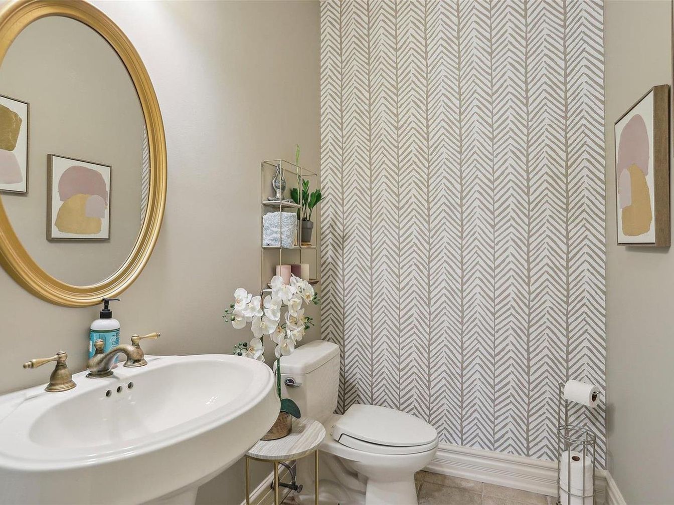 This bathroom space combines functionality with subtle elegance, featuring a white pedestal sink paired with antique-style brass fixtures that add a vintage touch. Above the sink, an oval mirror with a warm gold frame complements the soft beige walls. The toilet area is accented with a distinctive wallpaper showcasing a herringbone pattern in muted gray and white tones, creating visual interest while maintaining calmness in the space. A small round table beside the toilet holds a white orchid arrangement for a natural element, with a slim metal rack above it for storage and soft towels. Minimalist abstract art in gentle pastels enhances the refined yet cozy atmosphere.