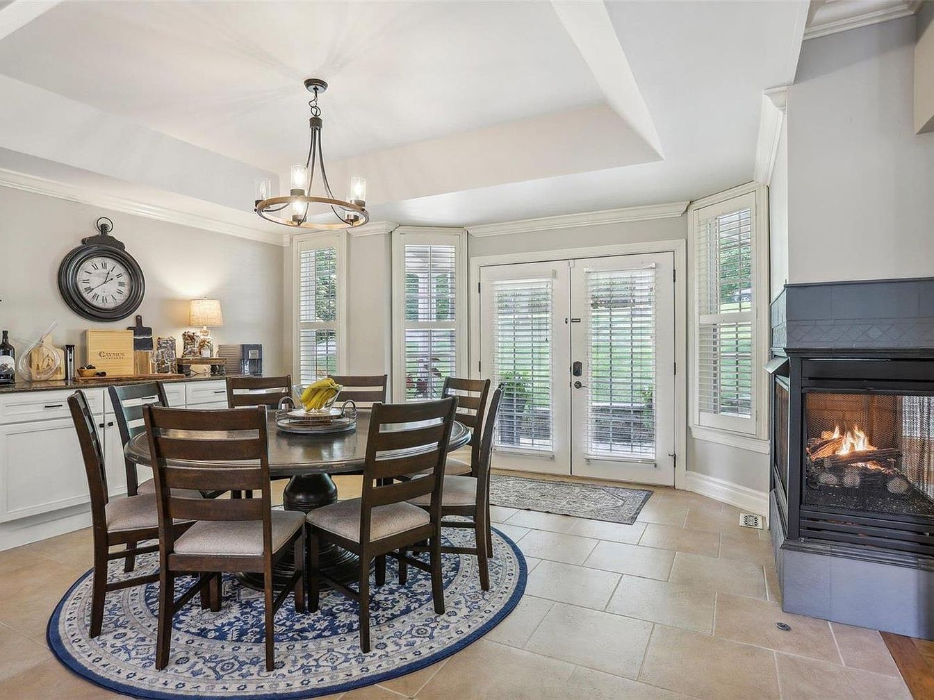 This cozy dining space features a round, dark wooden dining table surrounded by six matching chairs with cushioned seats, positioned over a circular blue and white patterned rug that anchors the area. The walls are painted a soft, neutral gray that complements the light beige tiled flooring. Bright natural light flows through large windows and a glass-paned double door, all adorned with white plantation shutters, creating an airy feel. A black-framed fireplace with a gentle fire burning adds warmth and a modern touch. White cabinetry along one wall includes countertop space styled with decorative items and a large black wall clock, enhancing the inviting and balanced aesthetic.