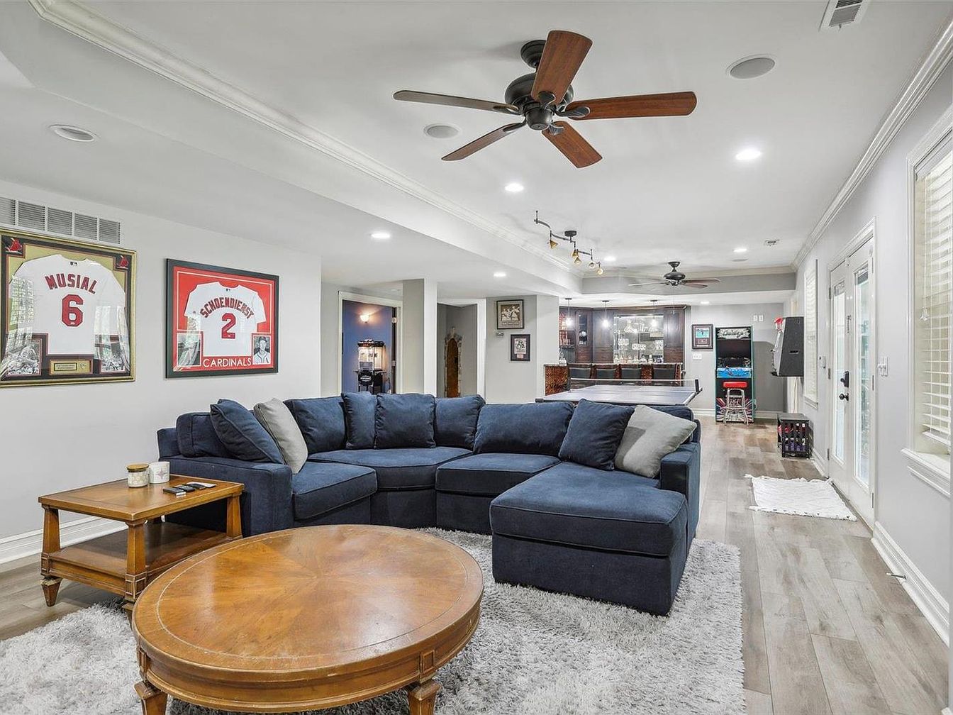 This spacious basement living area features a large, navy blue sectional sofa accented with neutral-colored throw pillows, providing ample seating for gatherings. The soft gray shag rug anchors the seating zone atop light wood flooring that complements the muted gray walls. A warm wood round coffee table and matching side table add classic charm. Framed sports jerseys adorn the left wall, adding a personal and nostalgic touch. Ceiling fans with dark wood blades enhance air circulation while recessed lighting brightens the open layout. Toward the back, a bar area and game station hint at entertainment focus, with natural light streaming through the French doors on the right.