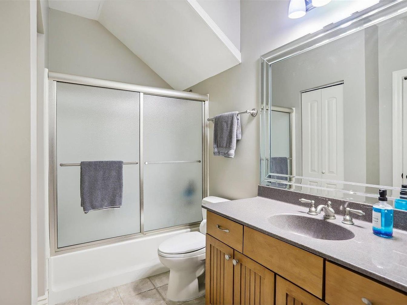 This bathroom features a practical layout with a built-in tub and shower enclosed by frosted glass sliding doors. The angled ceiling above the tub adds architectural interest while maintaining a clean, modern look. Wood cabinetry with beadboard detailing in a warm tone contrasts gently with the cool gray countertop and sink basin. Above the vanity, a large framed mirror reflects light from the contemporary dual-light fixture, brightening the space. Neutral walls complement the tiled floor, and matching gray towels coordinate cohesively, creating a balanced and inviting atmosphere in this well-organized bathroom.