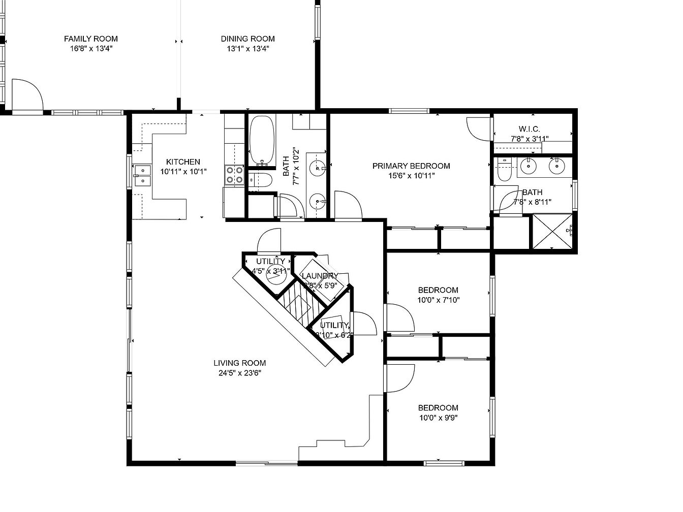 This well-organized floor plan highlights a spacious living room at the center, measuring 24’5” by 23’6”, creating a grand and open social hub. Connected to it is a compact kitchen, efficiently designed at approximately 11 by 10 feet, adjacent to the dining room sized 13’1” by 13’4”. The layout also includes a family room and three bedrooms including a generous primary bedroom with a walk-in closet and private bathroom. Additional utility and laundry areas are cleverly integrated into the space, maximizing functionality while maintaining open, flowing movement throughout the home.