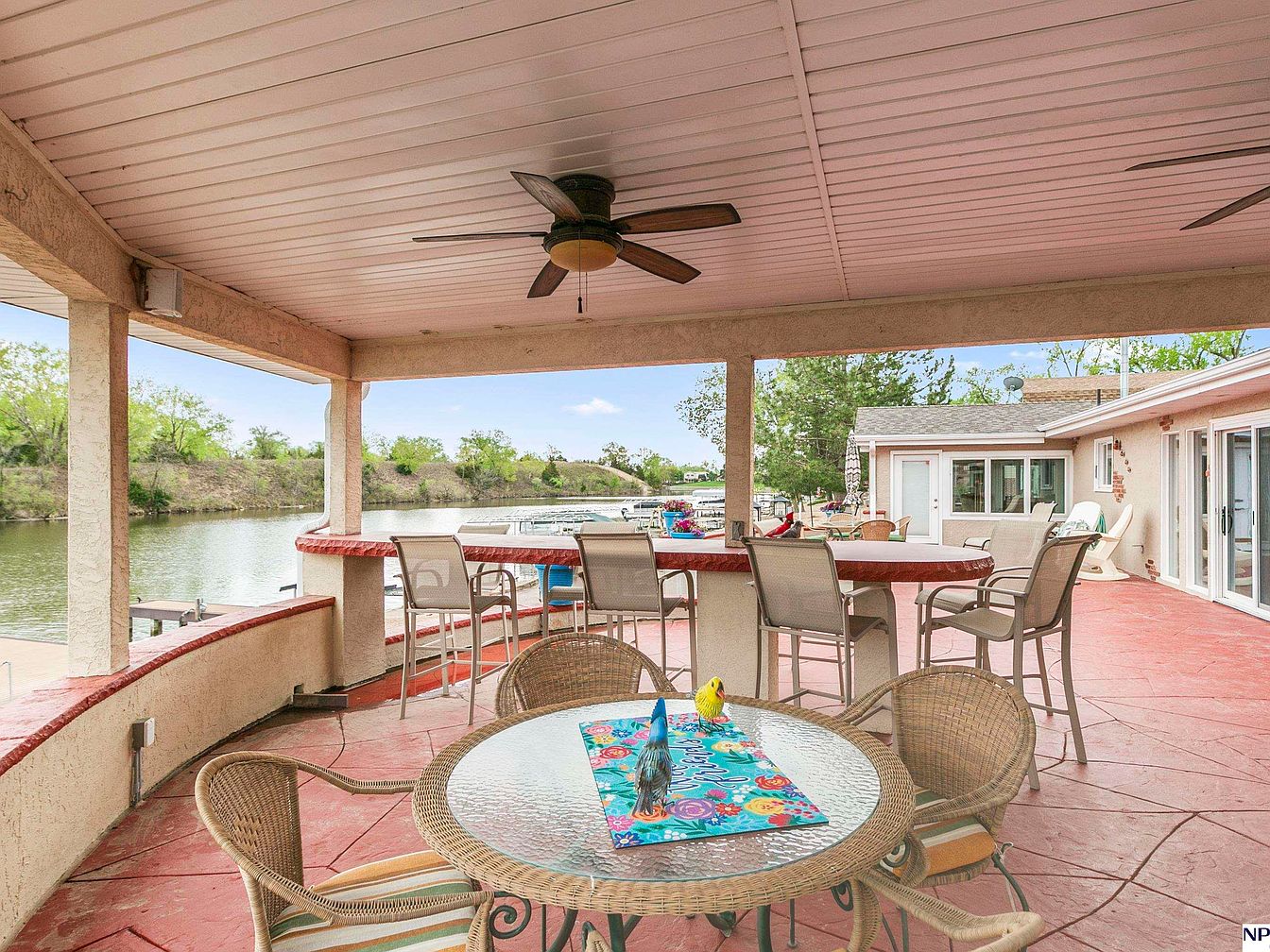 This spacious covered patio overlooks a tranquil waterway, creating a perfect blend of indoor-outdoor living. The ceiling is finished with white planked panels that complement the stucco walls and provide a clean, bright overhead space. A wooden ceiling fan with dark blades hangs centrally to offer a cooling breeze. The floor is stamped and stained a warm reddish color, adding texture and vibrance to the area. Seating includes a round glass-top table with wicker chairs featuring striped cushions, and a curved bar-height counter with multiple metal and mesh stools, ideal for entertaining while enjoying the scenic water view.