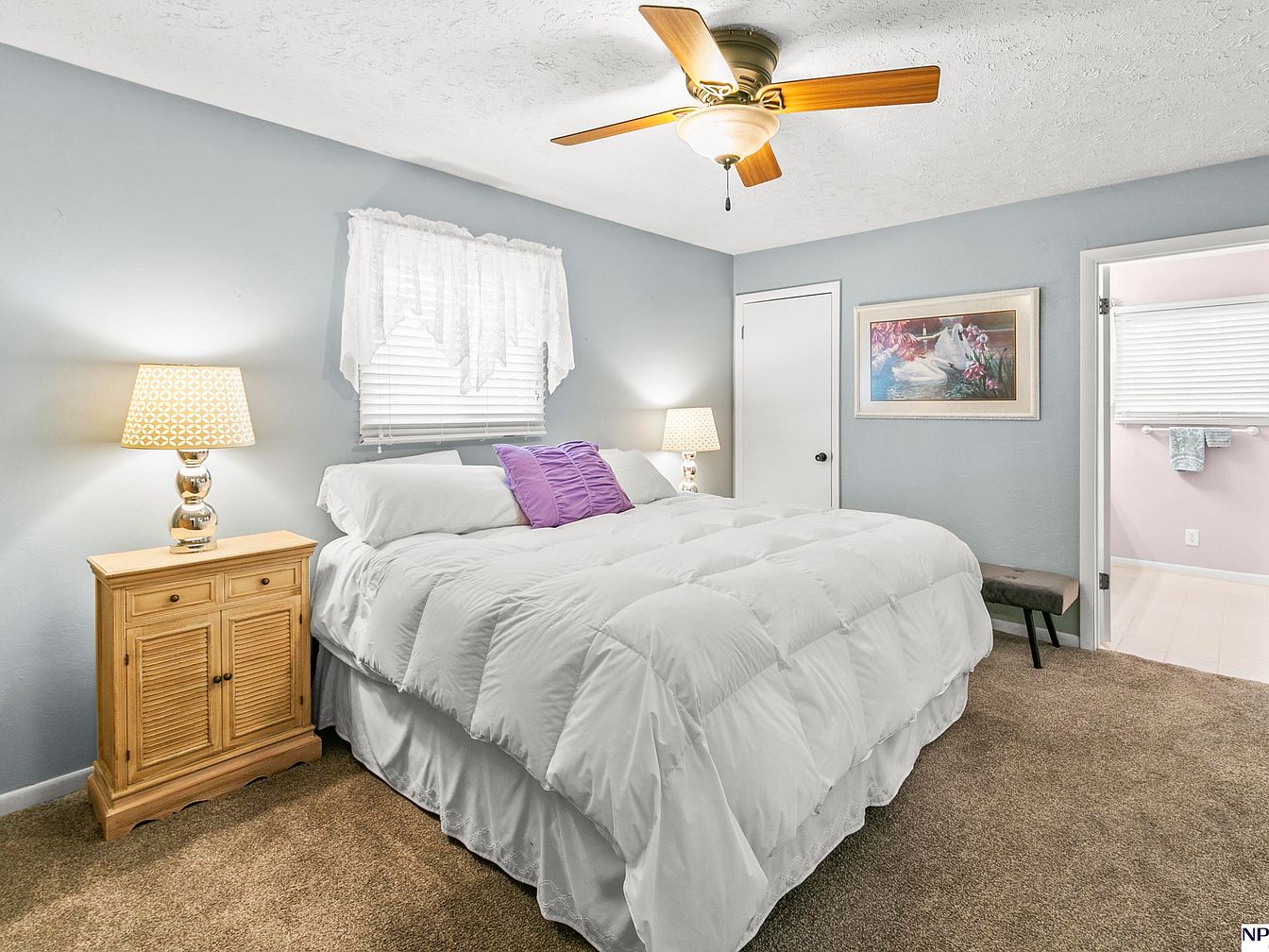 This master bedroom features a calming pastel blue wall color paired with soft brown carpeting, creating a cozy and serene atmosphere. A large bed dressed in a white comforter and matching pillows, including a single purple accent pillow, anchors the space. On either side of the bed, wooden nightstands with bright lamps provide balanced lighting. Above the bed, sheer white curtains soften the natural light coming through the window. A ceiling fan with wooden blades hangs overhead, complementing the warm tones of the furniture. A framed swan artwork and a small bench near the door add subtle touches of character and practicality. The open doorway reveals a glimpse of an adjoining bathroom with light pink walls and tiled flooring.