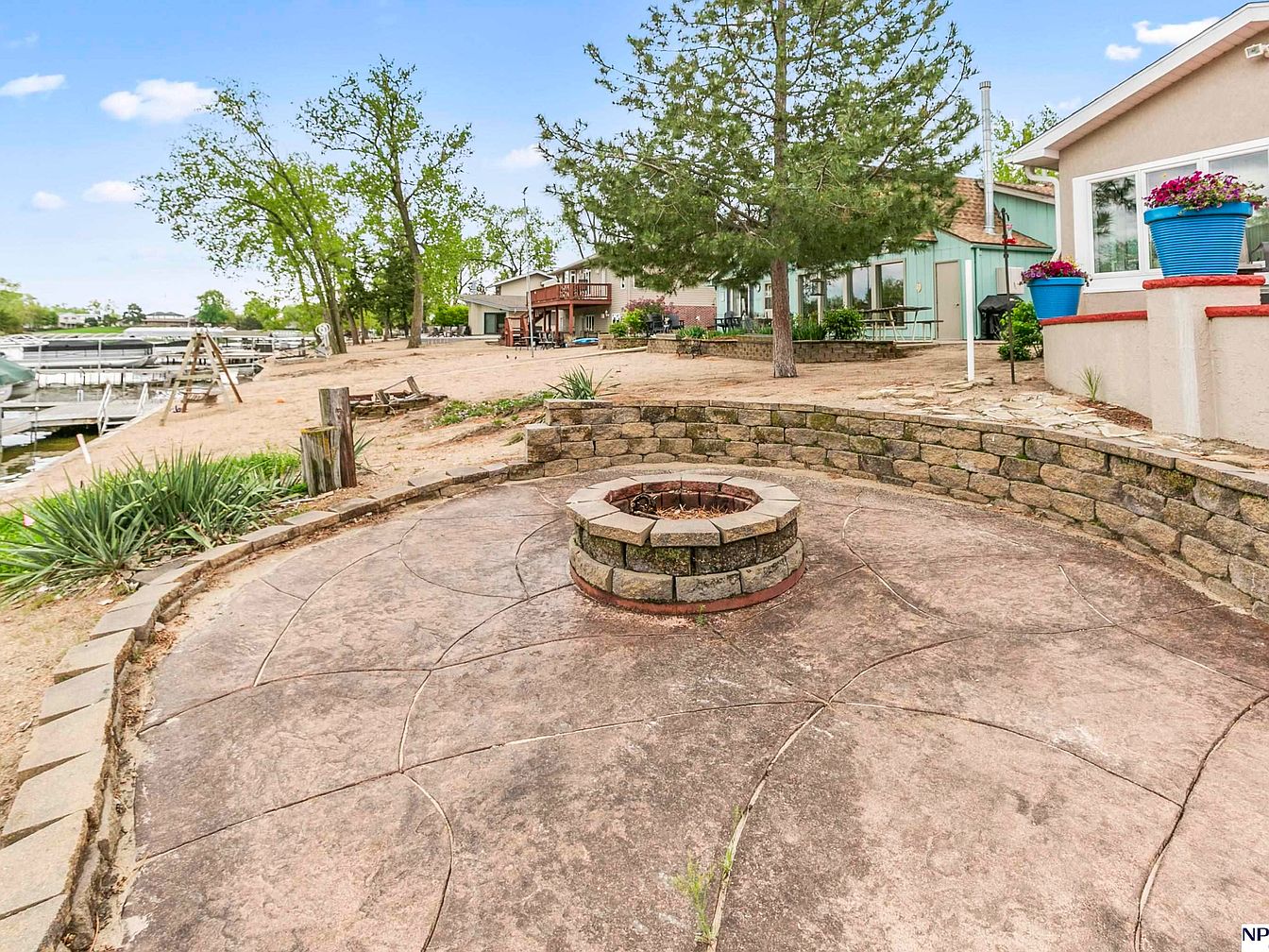 This backyard space features a circular stone firepit centrally located on a patterned concrete patio, bordered by a low retaining wall constructed of stacked stone blocks. Beyond the patio, a sandy shoreline leads down to a calm waterfront with dock access and moored boats. The area is shaded by mature trees, adding natural greenery and a sense of privacy. The house exterior visible here exhibits light-colored stucco with red trim, complemented by bright blue flower pots overflowing with vibrant blooms, offering a charming contrast and cheerful curb appeal in this serene lakeside setting.