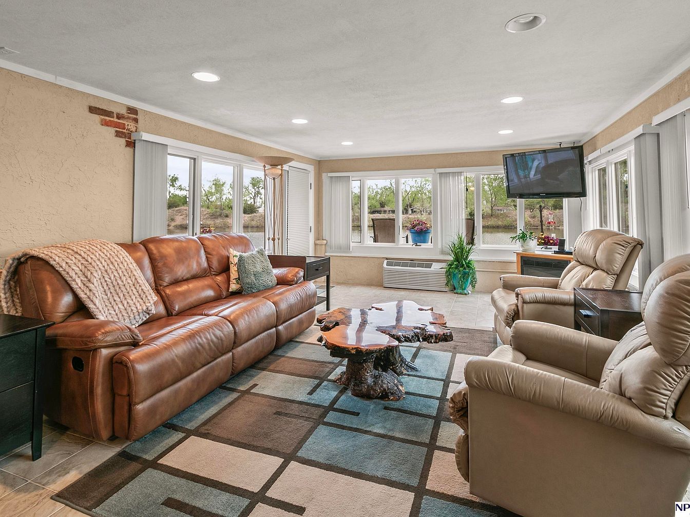 This sunroom offers a cozy yet stylish seating space with an earthy color palette of warm browns and neutral tones. Natural light flows in through large wraparound windows that create a bright and airy atmosphere while providing views of the outdoor scenery. The room centers around a striking rustic live-edge wood coffee table on a geometric-patterned rug blending shades of blue, brown, and beige. Reclining leather armchairs and a matching sofa add comfort, pairing classic craftsmanship with casual relaxation. Thoughtful touches like plants, a floor lamp, and mounted television complete this inviting retreat.