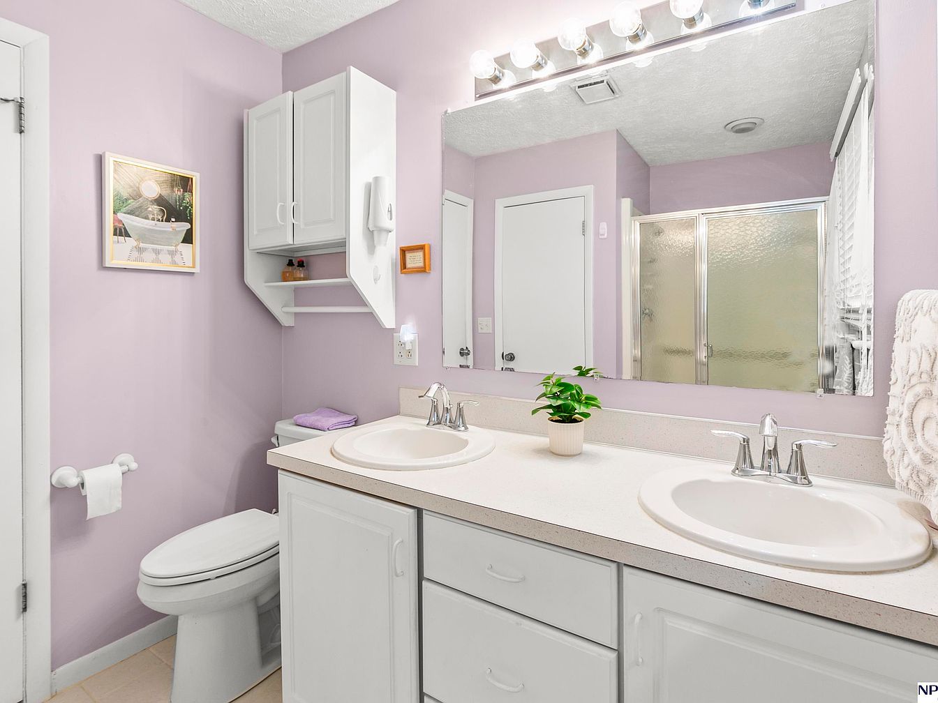 This bathroom features a soft lavender wall color that adds a calming atmosphere. The double vanity has a white countertop with two oval sinks, each equipped with chrome faucets. Underneath, white cabinetry provides ample storage, complemented by a matching overhead cabinet for additional space. A large rectangular mirror spans the width of the vanity, illuminated by a row of globe light bulbs above, enhancing brightness. A small potted plant adds a touch of greenery. To the left, a white toilet sits beneath a framed piece of art, and a frosted glass shower door is visible by the far wall. The overall design balances functionality with a fresh, gentle color palette.