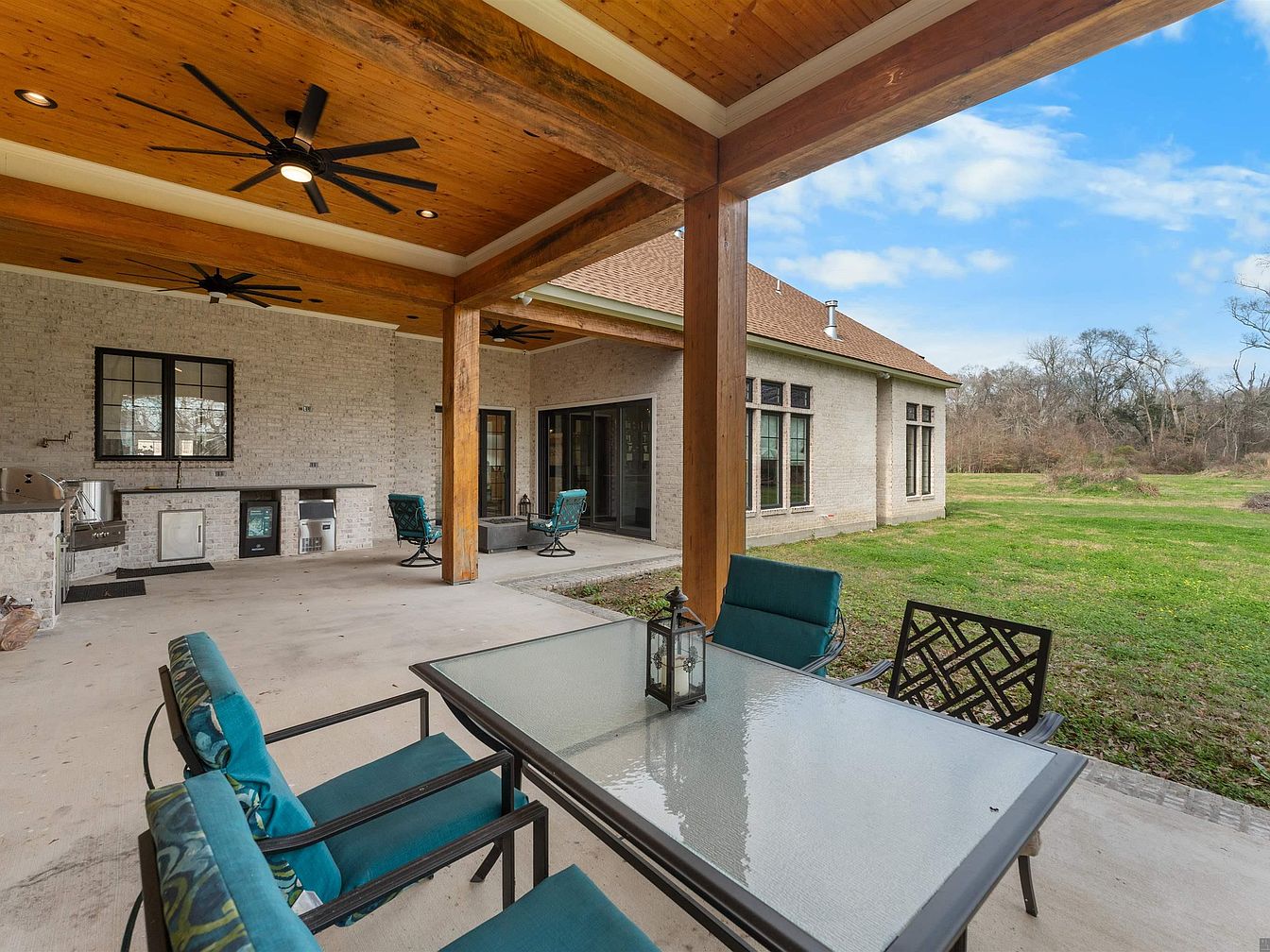 This covered patio area features a spacious outdoor living space with a natural wooden ceiling and large wooden support beams that add rustic charm. The ceiling is equipped with multiple large black ceiling fans, offering comfort on warm days. A built-in outdoor kitchen area is integrated along the light-colored brick wall, including a grill and storage. The seating area includes cushioned chairs in muted teal tones, paired with a glass-top dining table and a decorative lantern centerpiece. Sliding glass doors provide seamless indoor-outdoor flow, overlooking a vast green yard framed by natural woodland, creating a peaceful retreat atmosphere.