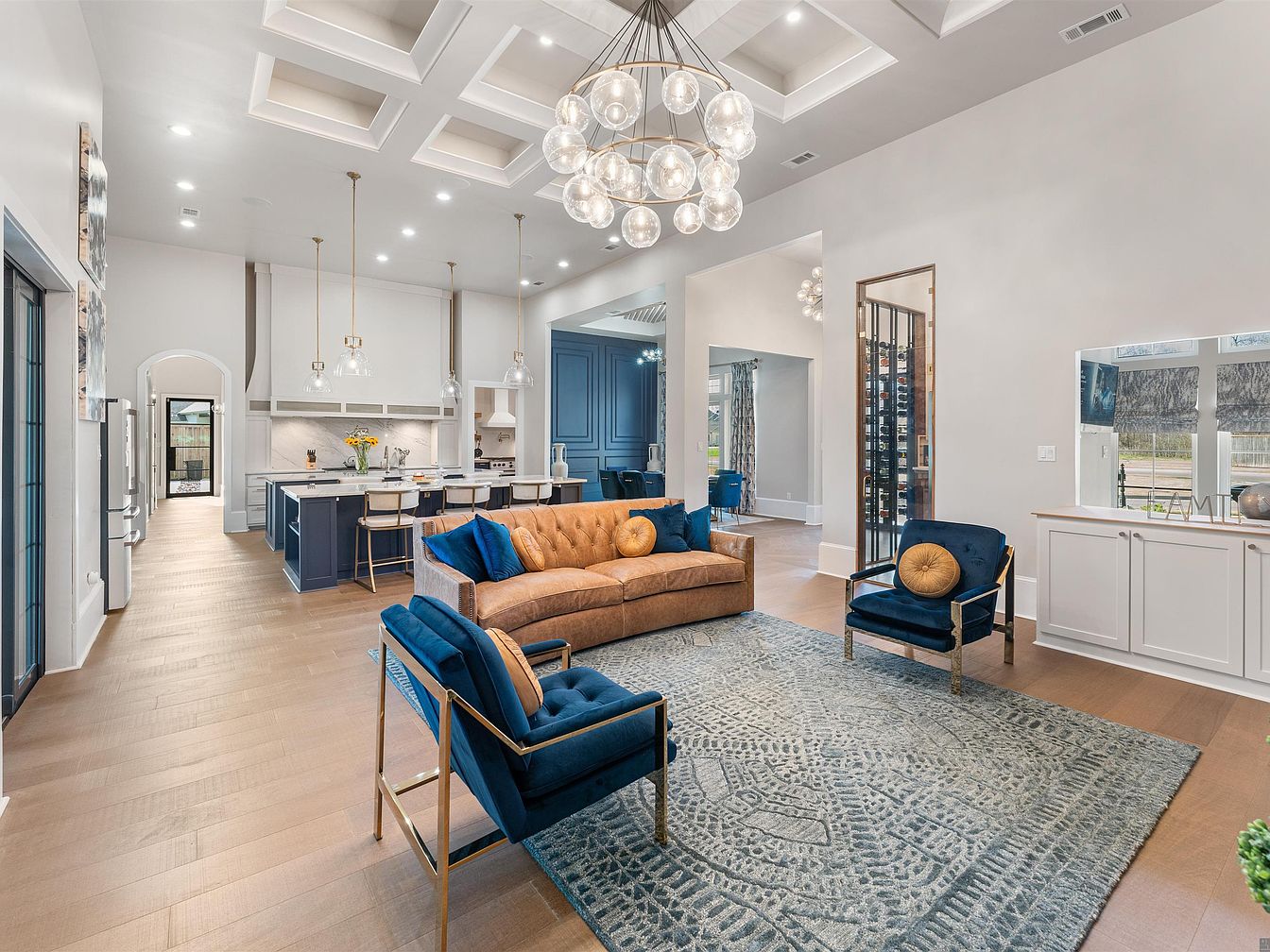 This expansive open-plan living area elegantly blends the seating and kitchen zones under a dramatic coffered ceiling, which features a modern, spherical chandelier centerpiece. The kitchen showcases a large island with navy blue cabinetry and white marble countertops, complemented by three pendant lights with clear glass shades. The living space is warmly inviting with a caramel-toned tufted leather sofa paired with deep blue velvet armchairs accented by gold frames and neutral throw pillows. The room’s color palette combines soft neutrals, navy, and caramel hues against light hardwood floors and crisp white walls, creating a sophisticated yet cozy atmosphere.