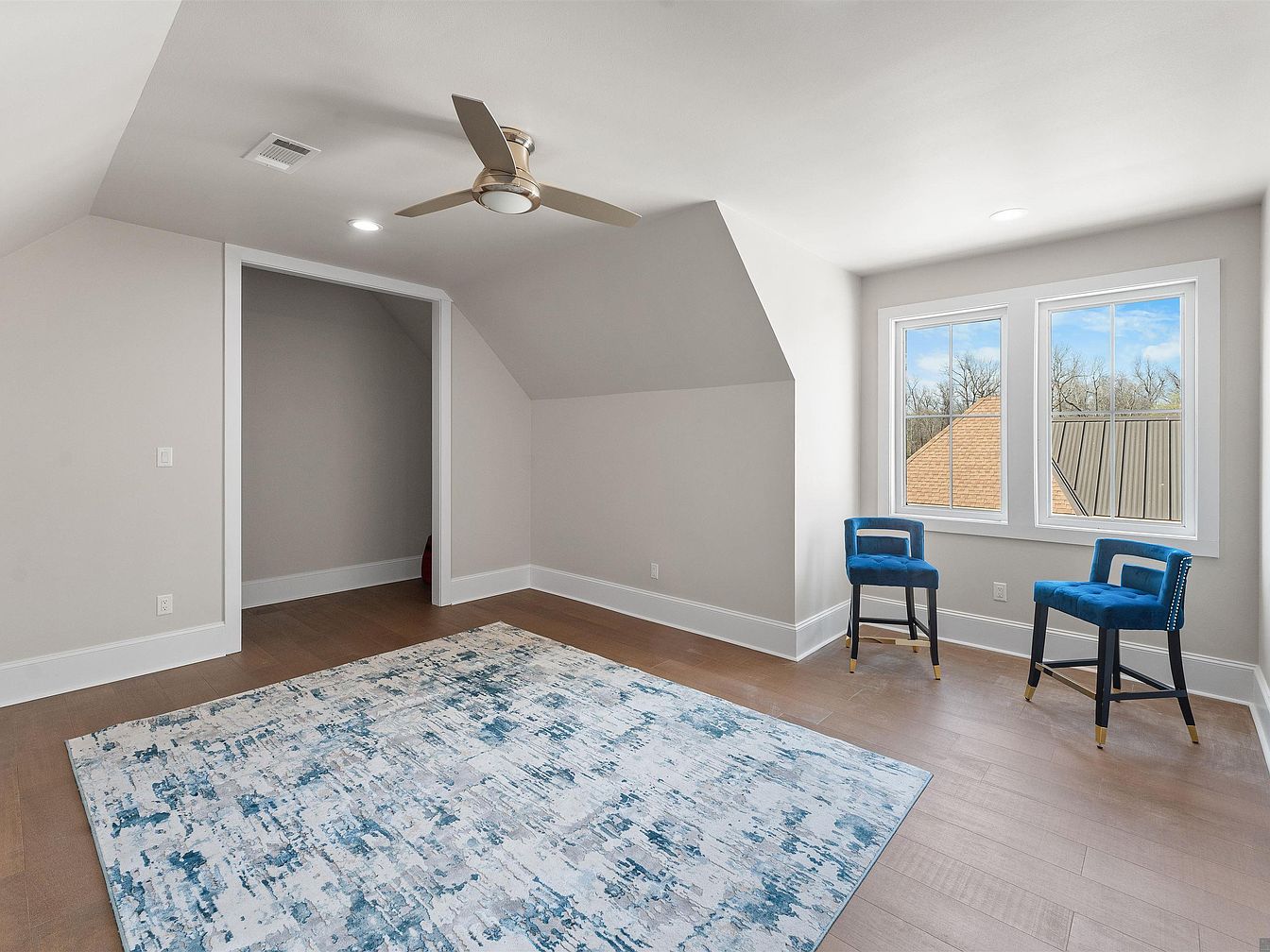 This cozy upstairs sitting area features a neutral color palette with soft gray walls and white trim, creating a light and airy ambiance. The wood flooring adds warmth, complemented by a large area rug with an abstract pattern in shades of gray and blue. Two plush, blue velvet accent chairs with black legs and gold tips provide stylish seating near a wide double window showcasing a scenic view outside. A modern brushed nickel ceiling fan offers function without disrupting the clean, minimalist aesthetic. The angled ceiling and open doorway hint at an adjacent space, adding architectural interest and flexibility to the layout.