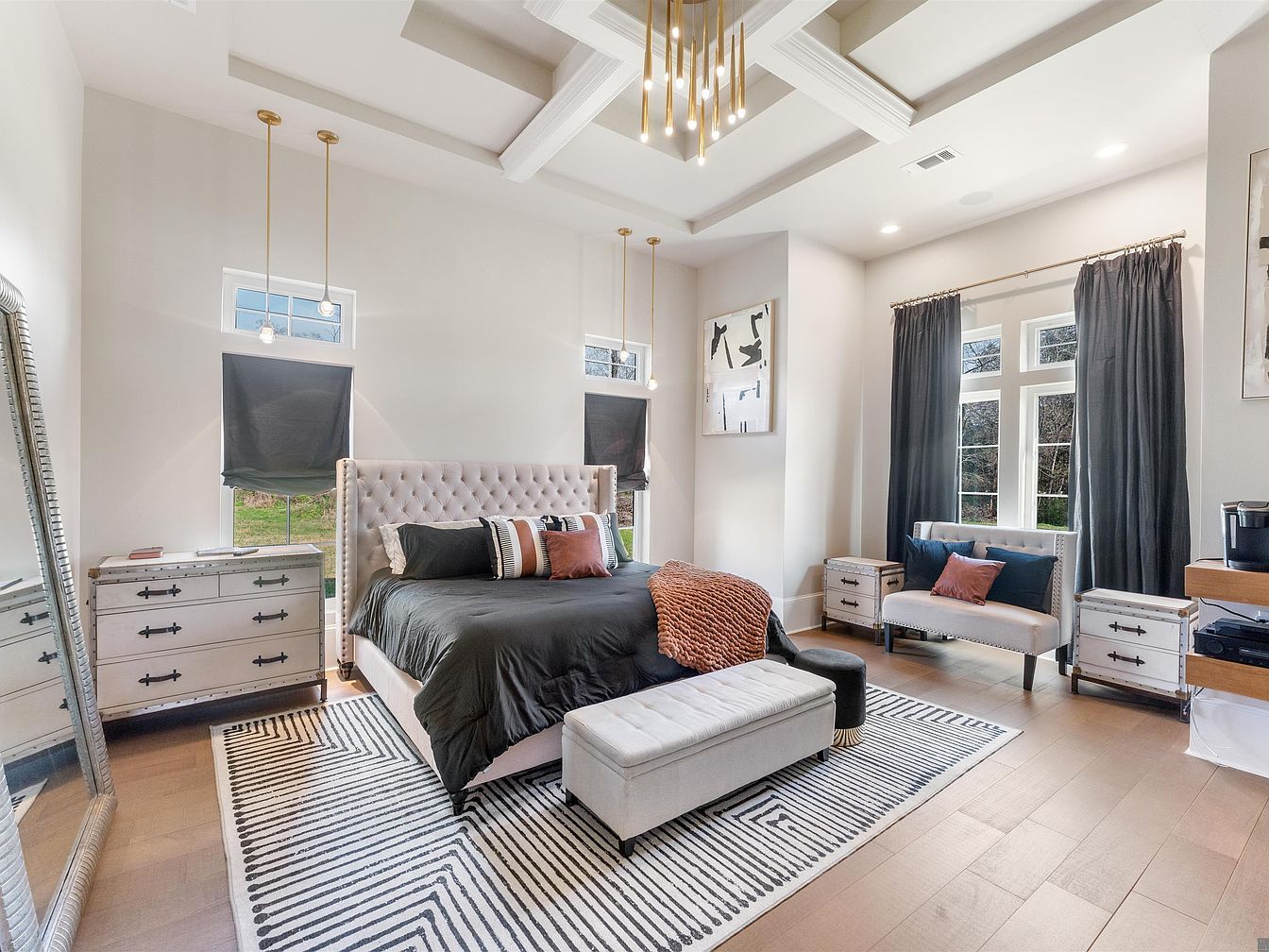 This spacious master bedroom features a high coffered ceiling with white beams, accented by a modern gold chandelier and matching pendant lights beside the bed. The large upholstered bed with a tufted headboard is dressed in dark bedding, contrasted by warm, earthy-colored pillows and a textured throw. Flanking the bed are two rustic, industrial-style dressers in light distressed wood, paired with black window shades. An area rug with a bold black-and-white geometric pattern anchors the room. A white upholstered bench and a small loveseat with pillows complement the seating area near the tall windows draped in dark curtains, which allow natural light to brighten the serene, neutral-toned space.