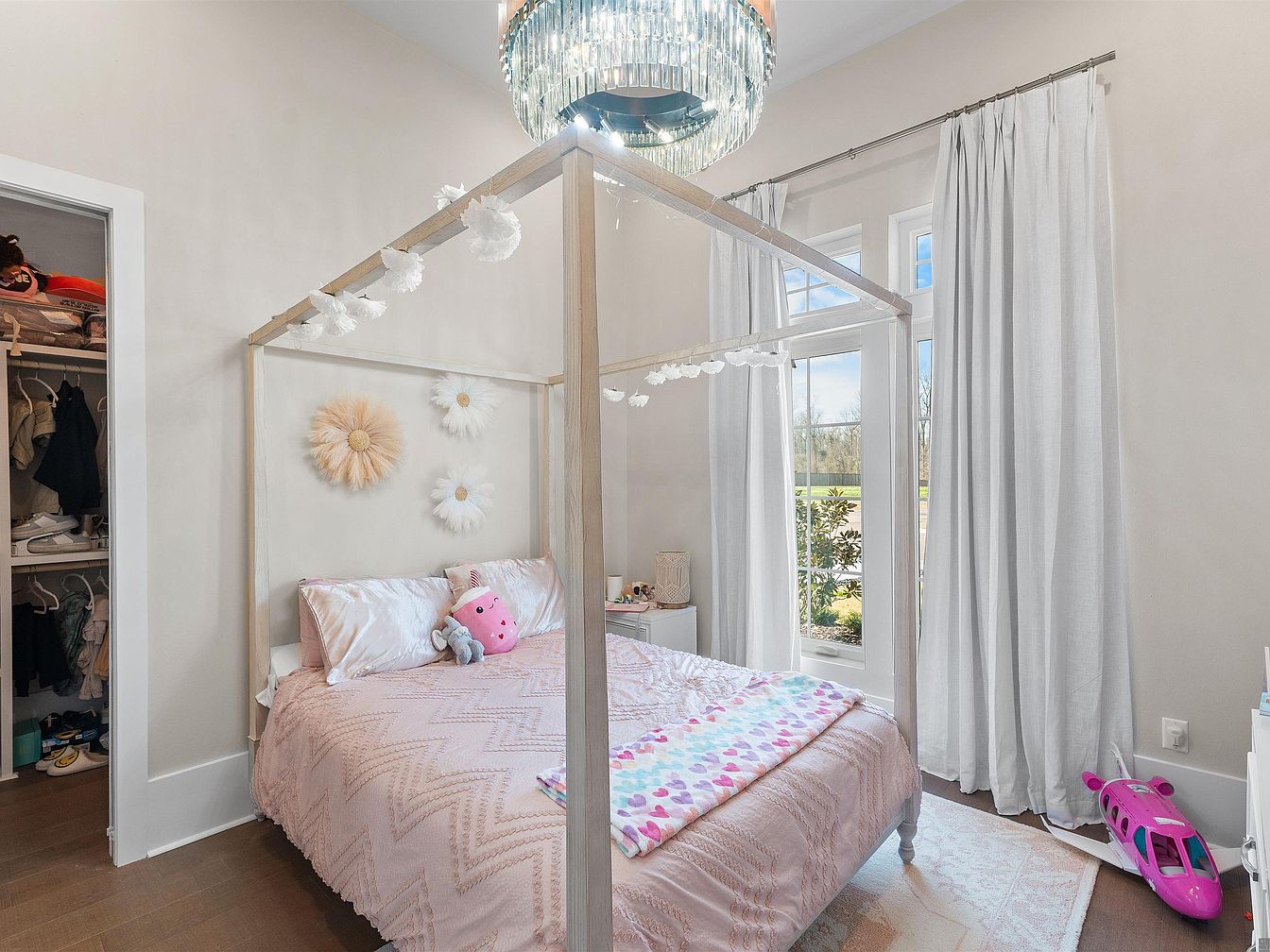 This cozy bedroom features a charming four-poster bed adorned with delicate white pom-pom garlands, setting a whimsical tone. Soft pink bedding with textured zigzag patterns complements shiny satin pillows and a plush heart-themed throw, enhancing the youthful ambiance. The walls are painted a gentle neutral, decorated with large, fluffy floral accents that add a playful touch. Natural light floods the space through tall windows dressed with sheer white curtains, creating an airy, serene atmosphere. A small bedside table holds personal items, and an open closet reveals organized clothing and shoes, balancing function and style in this inviting space.