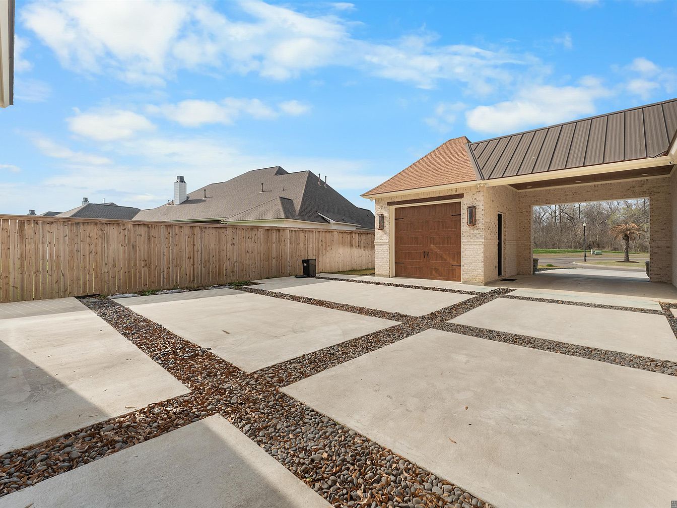 This exterior space features a spacious, modern driveway leading to a single-car garage with a rich, wooden door. The driveway is designed with large concrete slabs separated by narrow beds of smooth river stones, creating a clean, geometric pattern that adds visual interest. The garage structure is built with light-toned brick and has a sloped roof combining shingles and metal roofing. Two mounted wall lanterns flank the garage door, enhancing its curb appeal. A tall wooden fence encloses the area, providing privacy and a natural backdrop under a clear, bright blue sky.