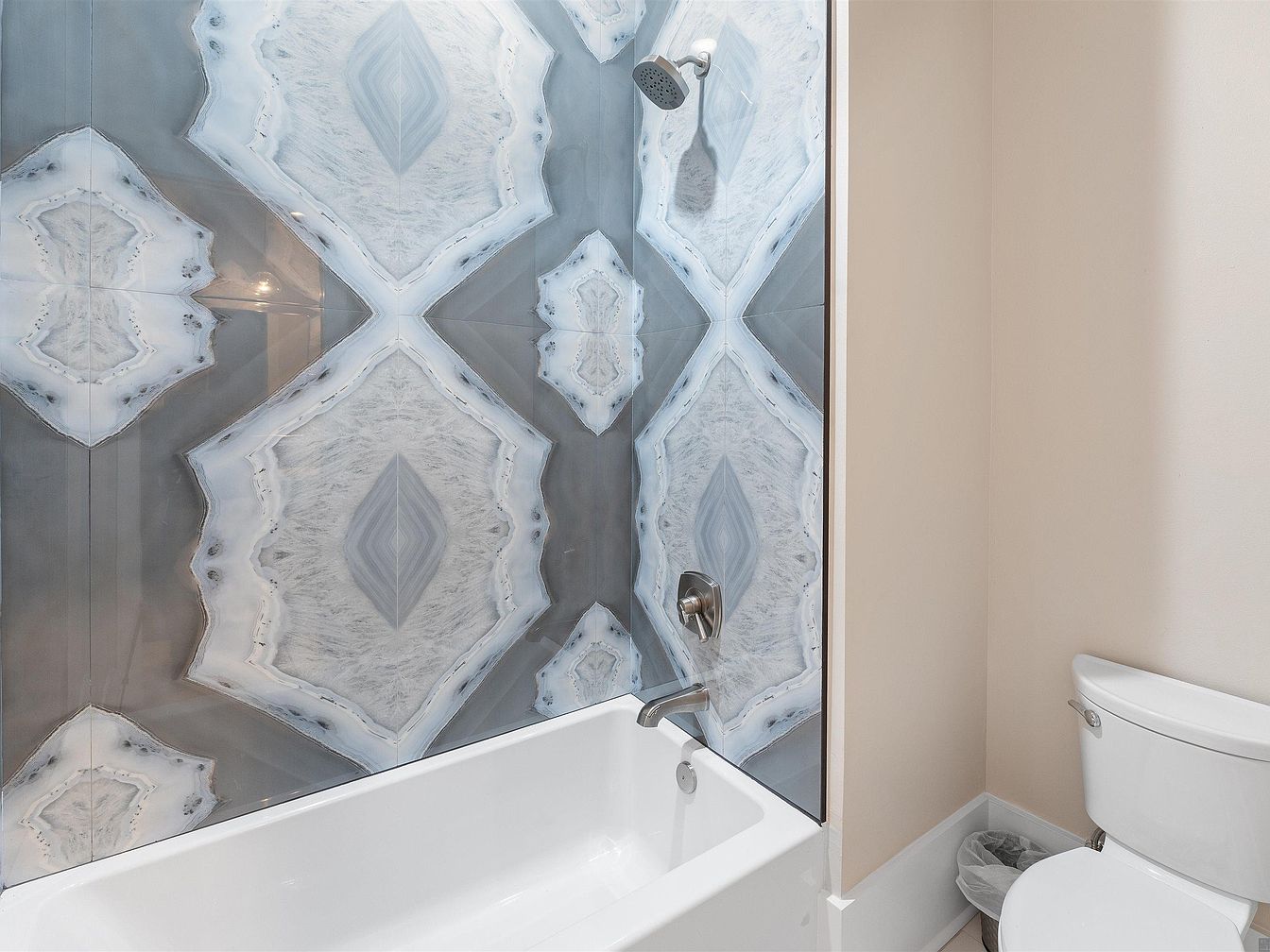 This bathroom features a clean, modern layout with a white bathtub and shower combination. The standout design element is the large-format tile surrounding the shower area, showcasing an intricate, symmetrical pattern resembling agate stone in cool tones of gray, white, and subtle blue hues. The fixtures, including the showerhead and faucet, have a sleek brushed nickel finish, adding sophistication. The walls outside the shower are painted a neutral light beige, which enhances the striking tile design without overwhelming the space. A white toilet sits adjacent to the tub, offering functional simplicity to this elegant, calming bathroom corner.