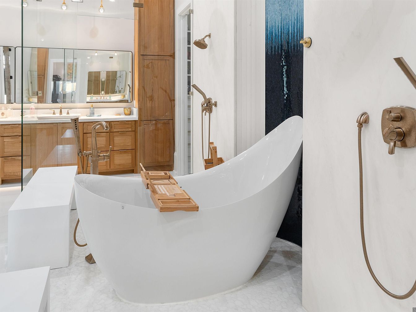 This master bathroom showcases a sleek, modern design focused on clean lines and natural elements. The centerpiece is a sculptural, white freestanding bathtub with a high back, complemented by warm bronze fixtures. A wooden tub tray adds both function and organic texture. Against the wall, a blend of smooth white surfaces and dark blue mosaic tiles provides a visually striking contrast, creating a subtle focal point. The cabinetry is crafted from natural wood with minimalist hardware, blending warmth into the space. A large mirror above the dual-sink vanity reflects ambient light, enhancing the room’s airy and serene atmosphere.
