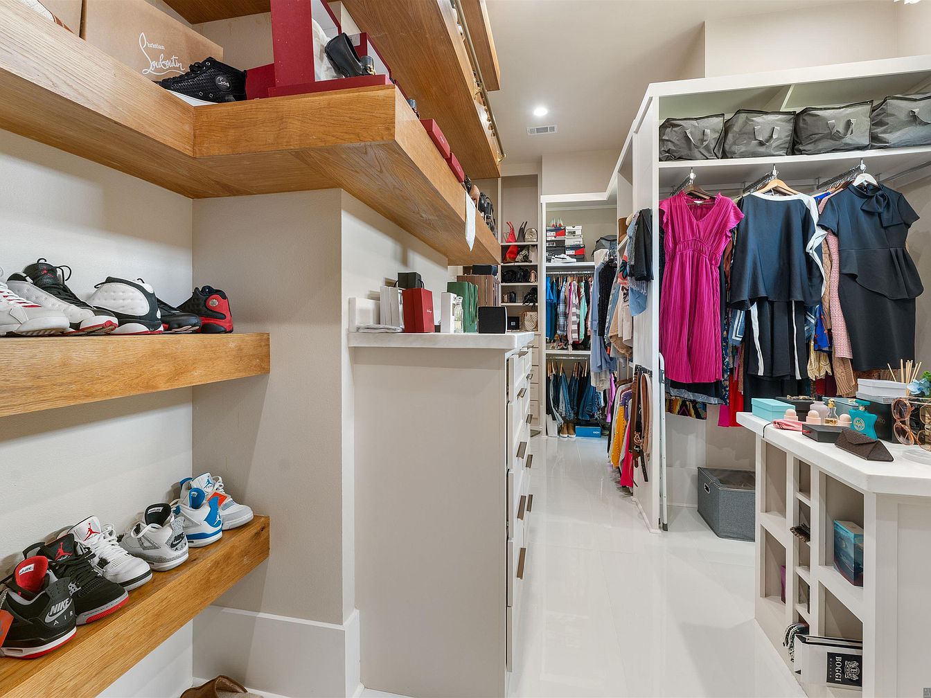 This expansive walk-in closet features a sleek and organized layout with a neutral palette dominated by soft beige walls and crisp white cabinetry. Open wooden shelves on the left side display an impressive collection of sneakers, emphasizing both functionality and style. To the right, hanging rods reveal a diverse wardrobe with colorful and dark garments, including vibrant dresses and formalwear, balanced by fabric storage bins above. The space is illuminated by recessed ceiling lights that highlight the glossy white tile flooring and clean lines of the built-in drawers and shelves, creating a streamlined and polished dressing area.