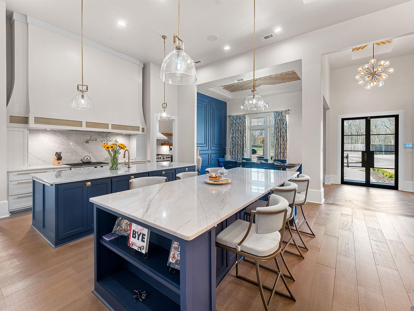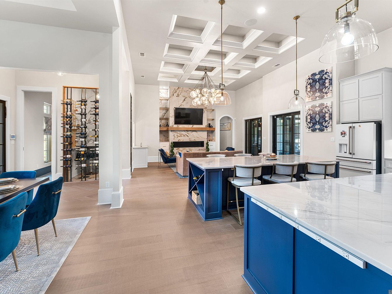 This spacious open concept area blends the kitchen and living room seamlessly. The kitchen features a bold blue island with marble countertops and integrated shelving, surrounded by cozy upholstered bar stools. Adjacent to the island, white cabinetry frames a stainless steel fridge, while two clear glass pendant lights hang gracefully from the ceiling. The living area invites relaxation with plush blue and neutral-toned seating centered around a striking marble fireplace topped with a mounted TV. A sophisticated coffered ceiling enhances the room’s height, while warm wood flooring spans the entire space, coordinating with the rich blue dining chairs and wine rack visible nearby.