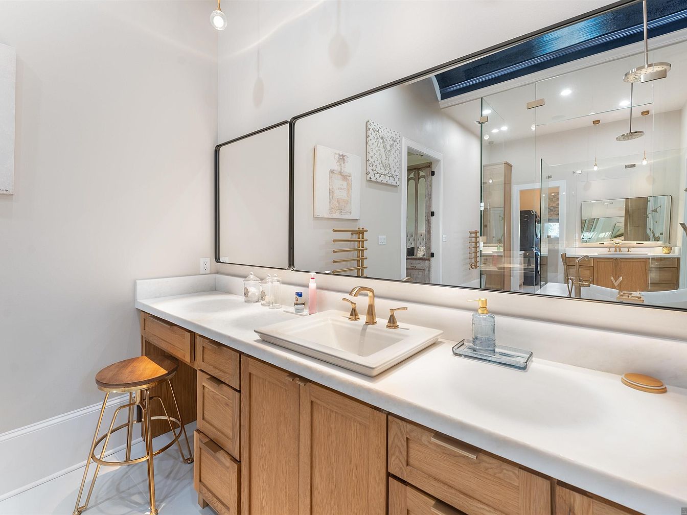This bathroom vanity features a spacious white countertop paired with natural wood cabinetry, offering a warm contrast. A wide, rectangular mirror with a sleek black frame stretches across the wall, enhancing the sense of space and light. Brass fixtures, including the faucet and the towel rack visible in the reflection, lend an elegant, warm metallic accent to the area. Light neutral wall colors and soft lighting create a calm and inviting atmosphere. A modern wooden and brass stool under the counter suggests a versatile space for grooming or sitting, blending functionality with clean, contemporary aesthetics.