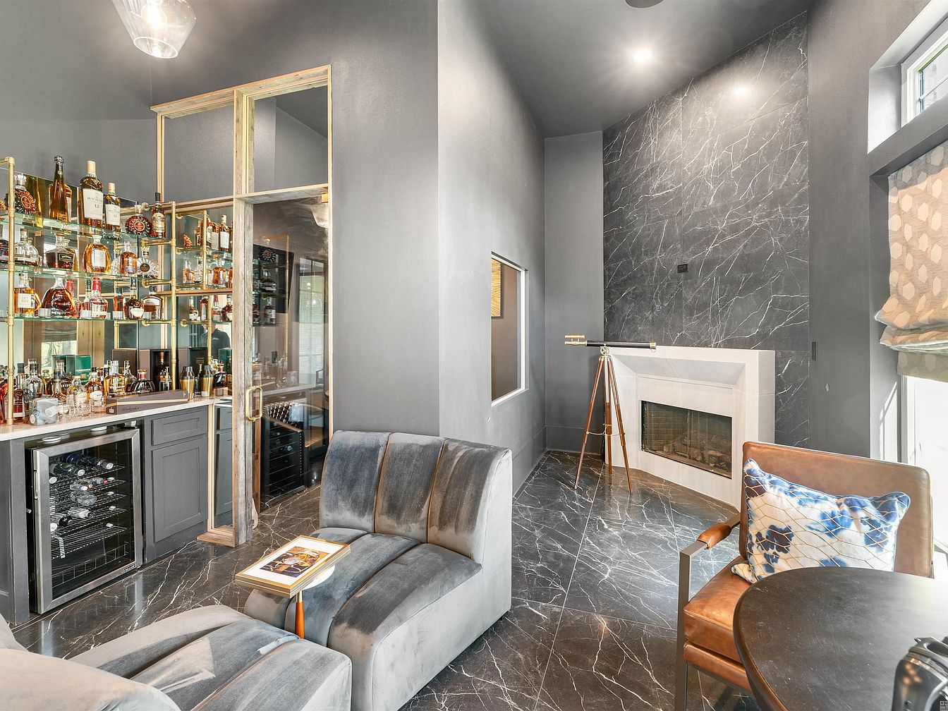 This intimate lounge area features a sleek home bar with mirrored shelving and brass accents showcasing a diverse collection of liquors. The space is drenched in a modern, moody gray palette, with striking black marble flooring and wall tiles featuring white veining for dramatic contrast. A comfortable velvet curved sectional faces a contemporary white-framed fireplace nestled in a tall gray wall. Natural light filters through a window with a patterned Roman shade, enhancing the blend of textures. A wooden tripod telescope and a leather chair with blue-patterned cushions add unique, personalized touches to this stylish retreat.