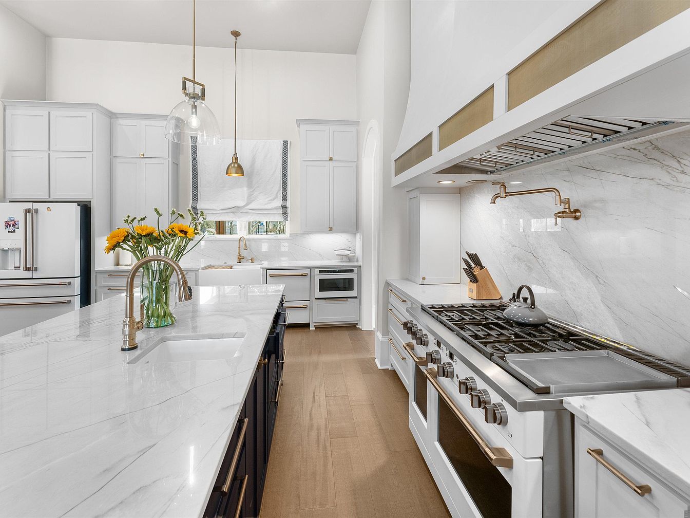 This bright kitchen features a sophisticated mix of white and dark cabinetry paired with expansive marble countertops that extend throughout the island and backsplash. The island incorporates an integrated sink with a brushed gold faucet, complemented by a vase of fresh sunflowers adding a natural touch. Pendant lights hang elegantly overhead, one glass with a modern design and the other brass with a warm glow, contributing to the inviting atmosphere. The stainless steel range includes a versatile griddle and a brass pot filler mounted on the marble backsplash, enhancing both functionality and style. Light oak flooring grounds the space with a warm contrast.