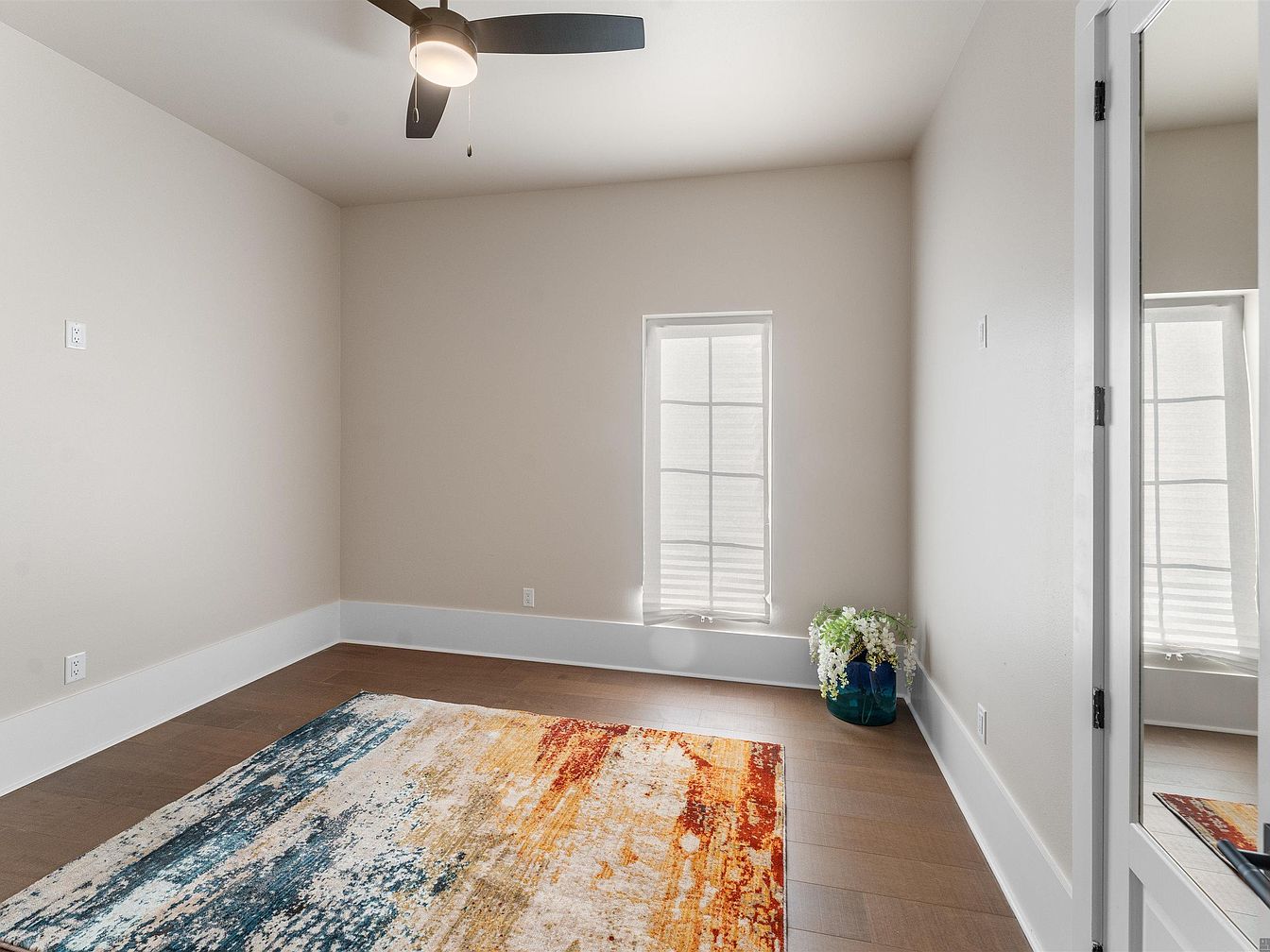 This quiet bedroom corner features a soft, neutral color palette dominated by off-white walls and a white baseboard that contrasts beautifully with warm-tone wood flooring. A colorful area rug with an abstract pattern in blue, beige, and burnt orange anchors the space, adding texture and vibrancy. A small, vertically oriented window, fitted with a light-filtering Roman shade, allows natural light to gently illuminate the room. The black ceiling fan adds a modern touch to the simple ceiling design. A blue vase with cascading white flowers provides a subtle decorative accent near the window, contributing to the room’s calm and uncluttered atmosphere.