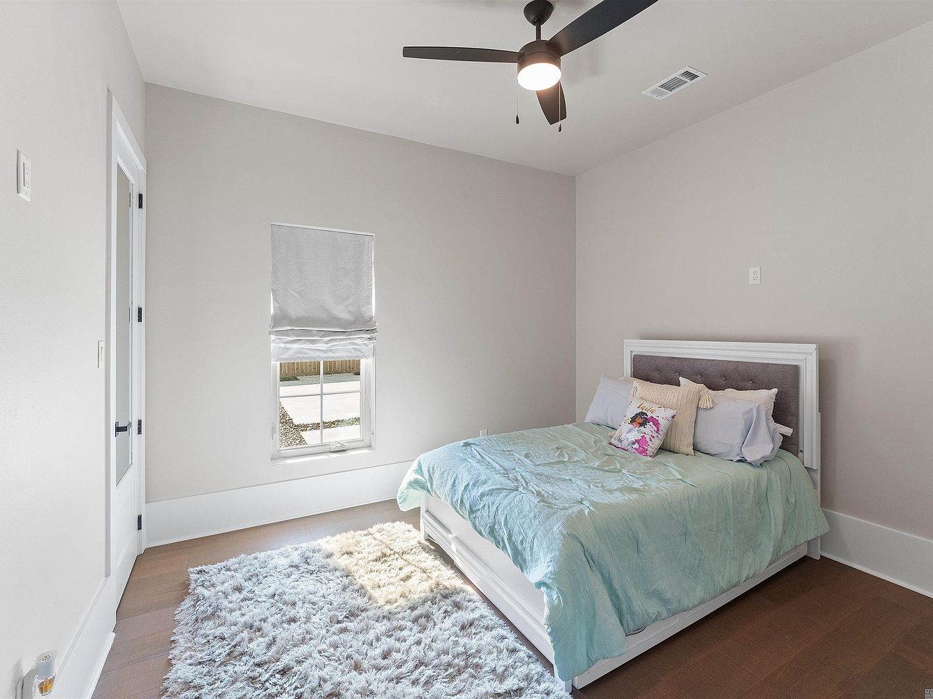 This peaceful bedroom corner features soft, neutral walls that create a calming atmosphere. A white bed frame with a tufted gray headboard anchors the space, dressed in a pastel teal comforter and accented by decorative pillows. Natural light filters through a single window covered with a white roman shade, brightening the room. The light wood flooring complements the muted palette, while a plush, textured area rug adds warmth and comfort underfoot. A sleek black ceiling fan with a built-in light fixture offers modern functionality, highlighting the room’s simple yet inviting design.