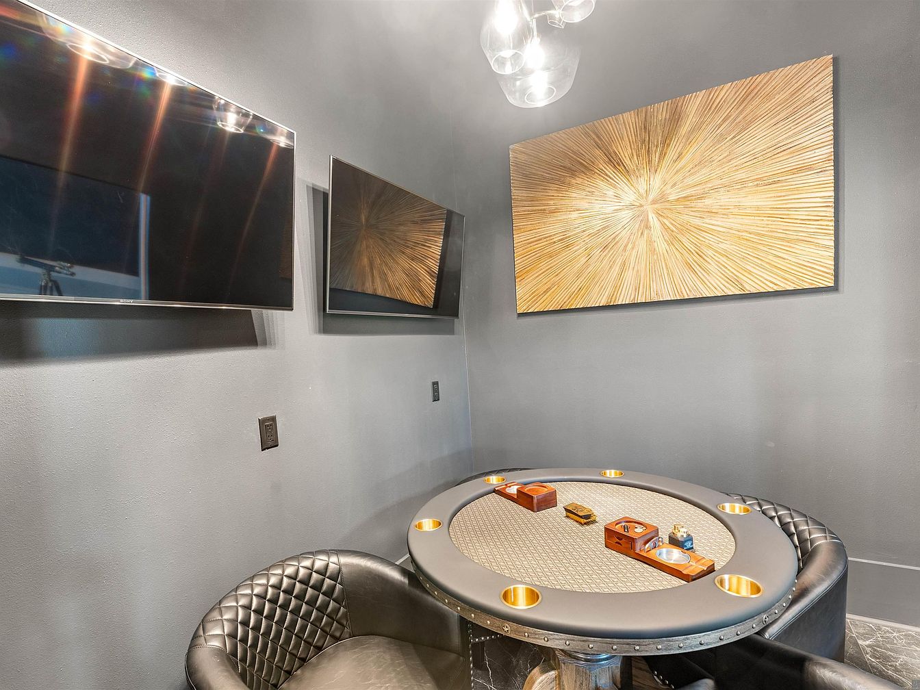 This cozy corner of the home is designed as an intimate gaming space, featuring a round poker-style table with a padded peripheral rim adorned with built-in golden cup holders. The table surface showcases a subtle geometric pattern, complemented by a few wooden and decorative items set in the middle, suggesting a spot for relaxed card games or cigar enjoyment. Surrounding the table are black leather, quilted-back chairs offering comfort and style. The walls are painted in a muted gray tone, highlighting a striking, large textured gold artwork that creates a radiant focal point, while two flat-screen TVs mounted side by side enhance the entertainment experience with a modern touch.