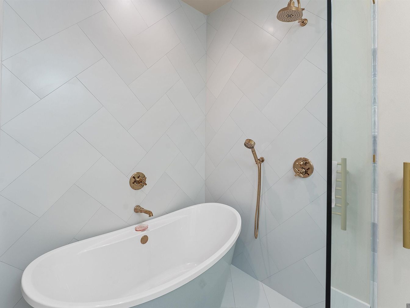 This bathroom features a sleek, modern design with a freestanding white bathtub as the focal point. The walls are adorned with large, matte light gray tiles arranged in a subtle diagonal pattern, lending the space a clean and sophisticated look. Elegant brushed gold fixtures, including a wall-mounted bath spout, handheld shower, and overhead rain shower, add a touch of luxury and warmth against the cool tile backdrop. A glass partition on the right introduces a sense of openness while maintaining separation. The minimalist color palette and refined details create a tranquil, spa-like atmosphere.