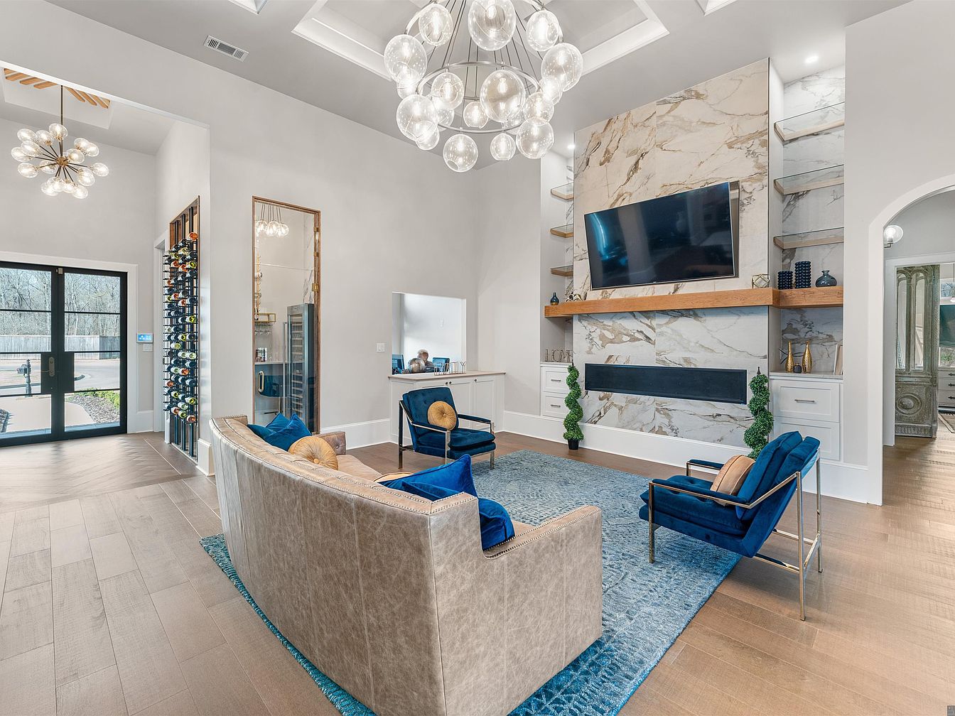 This living room features a sophisticated and open layout with high ceilings that enhance the airy feel. The focal point is a large wall clad in polished marble with natural beige and brown veining, anchored by a modern linear fireplace and a mounted flat-screen TV above a floating wooden mantel. Flanking built-in cabinetry with shelving showcases decorative accents in metallic tones. Seating includes a taupe leather sofa and two plush blue velvet armchairs accented with contrasting throw pillows, arranged on a textured blue area rug that complements the furniture. Unique bubble-style chandeliers hang from the ceiling, adding artistic flair and ambient lighting. Adjacent glass doors and windows allow natural light to fill the space, seamlessly blending indoor elegance with outdoor views. To one side, a sleek wine rack and built-in beverage fridge contribute to the room’s luxurious and inviting atmosphere.