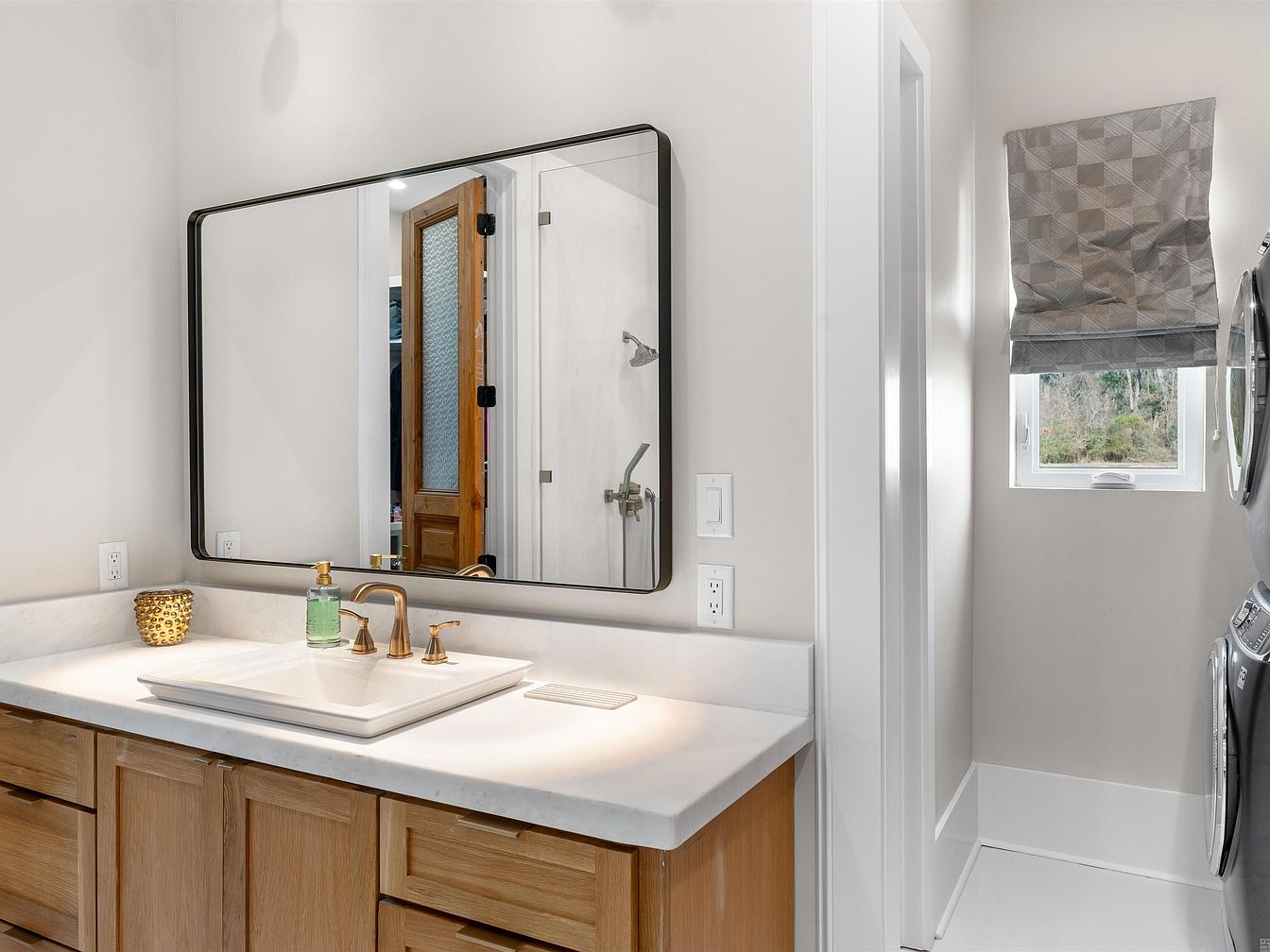 This section blends a modern bathroom vanity with an adjoining laundry area. The vanity features a sleek white countertop with a square undermount sink paired with brushed gold fixtures adding a touch of elegance. The cabinetry below is made from light wood with recessed panel doors that introduce warmth and texture. A large rectangular mirror with thin black framing extends across the wall above the sink, reflecting natural light. Adjacent to the vanity, a small laundry nook houses a stacked washer and dryer beside a narrow window adorned with a subtle patterned Roman shade, enhancing both functionality and style.