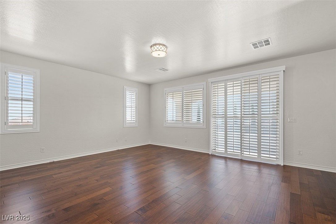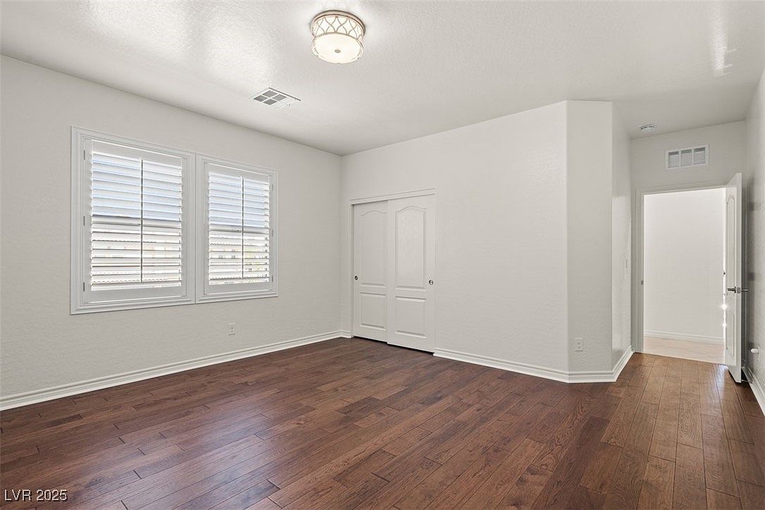 This bedroom features a spacious and clean layout with neutral white walls and a smooth ceiling, enhancing the sense of openness. Two large windows fitted with white plantation shutters allow ample natural light while maintaining privacy. The warm, rich brown hardwood flooring adds contrast and elegance to the otherwise minimalist design. A double-door closet with paneled doors provides functional storage space. The room transitions smoothly into a hallway, visible through a doorway on the right, making this space versatile and ready for personalized furnishings and decor.