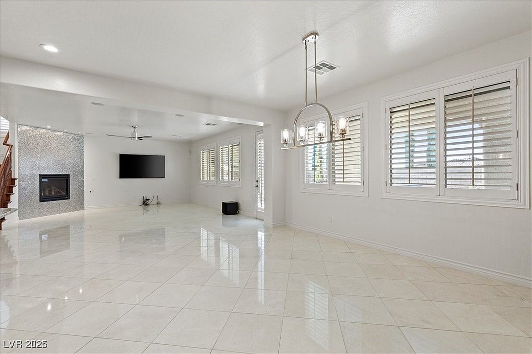 This spacious open-plan area combines living and dining functions with a sleek, modern aesthetic. The room features large, glossy cream-colored floor tiles arranged diagonally, which amplify the natural light flooding in through multiple white plantation-shuttered windows. The walls and ceiling are painted a bright white, enhancing the airy and clean atmosphere. A contemporary chandelier with a brushed metal finish hangs over the dining space near the windows. Toward the living area, a wall-mounted flat-screen TV centers the room, with a chic fireplace framed by reflective mosaic tiles adding subtle texture and warmth. A ceiling fan and recessed lighting provide additional comfort and illumination.