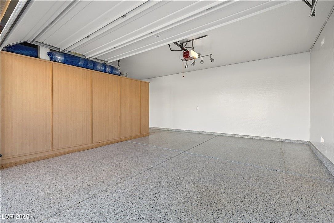 This spacious garage features a polished, speckled epoxy floor in neutral tones, enhancing durability and cleanliness. The walls are painted bright white, contributing to a clean, modern feel and maximizing natural light reflection. A large set of light wood built-in cabinets lines one side, providing ample organized storage space and minimizing clutter. The ceiling incorporates a white automated garage door with a mounted opener and a simple track lighting system with adjustable spotlights, adding functionality and ease of use. The overall design emphasizes practicality and order while maintaining a fresh, streamlined aesthetic.