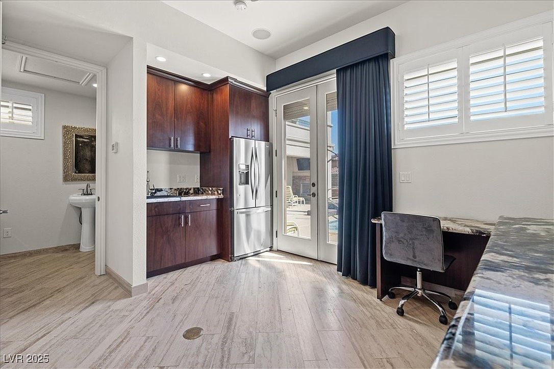 This bright kitchen features a clean modern design with light-colored tile flooring and crisp white walls decorated with classic white plantation shutters. Rich, dark wood cabinetry with sleek silver handles contrasts beautifully with the polished granite countertops that extend into a small workspace area adorned with a comfortable, grey swivel chair. A stainless steel refrigerator blends seamlessly into the layout. French doors with bold dark blue curtains lead to a sunlit outdoor space, enhancing the natural light. An adjacent powder room can be seen through an open doorway, adding functionality to the elegant and organized space.