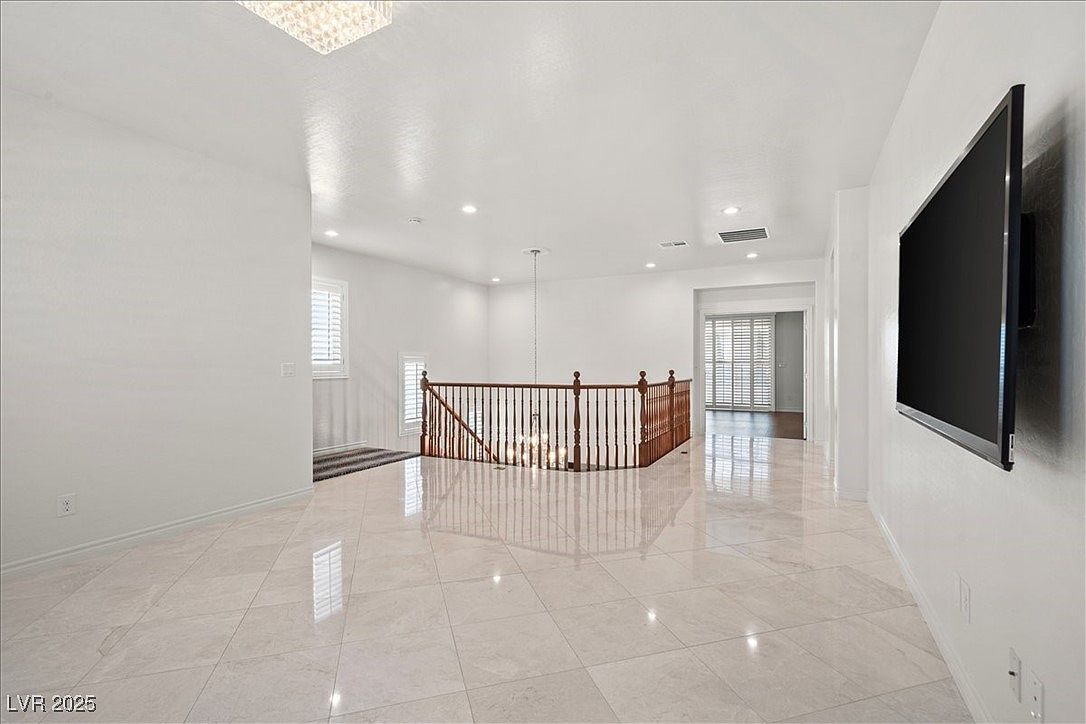 This bright upstairs landing features large, glossy cream-colored marble tiles that reflect light beautifully, enhancing the spacious feel. Walls painted in soft white create an airy and clean atmosphere. A wooden railing with turned balusters surrounds the staircase, adding warmth and traditional detail. Recessed ceiling lights provide subtle illumination, while a stylish square chandelier hangs over the stairwell, introducing a modern touch. A flat-screen TV is mounted on the wall, indicating this space could serve as a small lounge or media area. Adjacent rooms with wide walkways and classic plantation shutters suggest seamless connectivity to other living spaces.