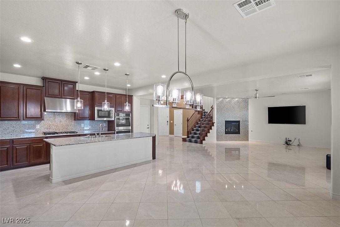 This spacious open-concept area combines a modern kitchen with a connected living space. The kitchen features rich dark wood cabinetry paired with sleek stainless steel appliances, including a built-in microwave and double oven. A large granite island with a sink offers ample workspace, while three pendant lights hang above, adding a contemporary touch. The floor is finished with polished cream-colored tiles that extend throughout the room, enhancing brightness and flow. A built-in fireplace with a shimmering tile surround anchors the living area. Neutral walls and recessed lighting create a clean, elegant backdrop, complemented by a modern chandelier above the dining zone. A staircase with a wooden banister leads upstairs, further defining the open layout.