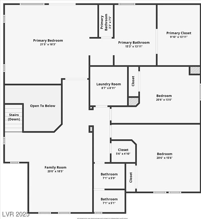 This floor plan reveals a spacious second story, featuring a large primary bedroom with an attached primary bathroom and a generous walk-in closet. The primary bath includes an additional smaller primary bathroom, suggesting a luxury en-suite setup. Two additional bedrooms each have access to separate bathrooms and closets, offering privacy and convenience. A sizable family room anchors this level, positioned adjacent to the stairwell leading down. A laundry room is centrally placed for easy access, and several closets are integrated into the hallway, maximizing storage options. The design balances open communal areas with intimate private spaces, all carefully proportioned for comfort and functionality.