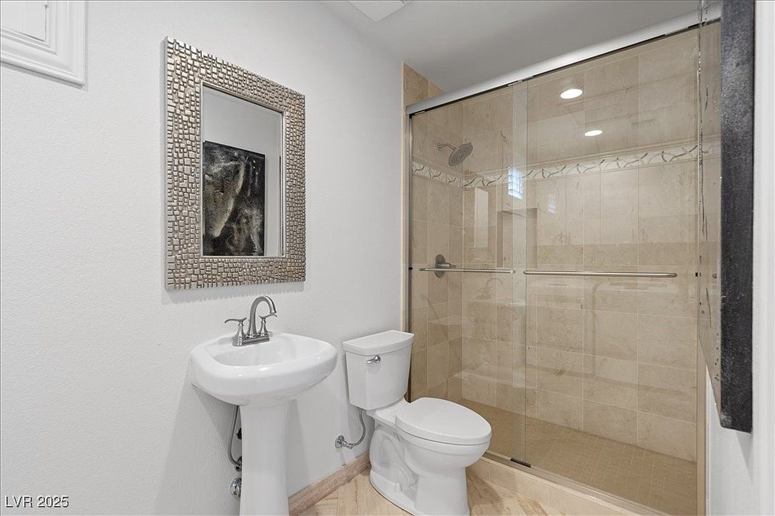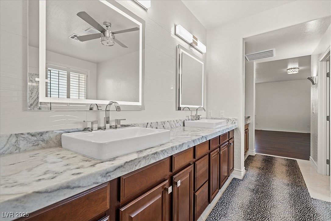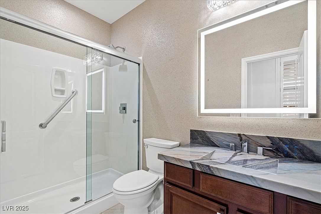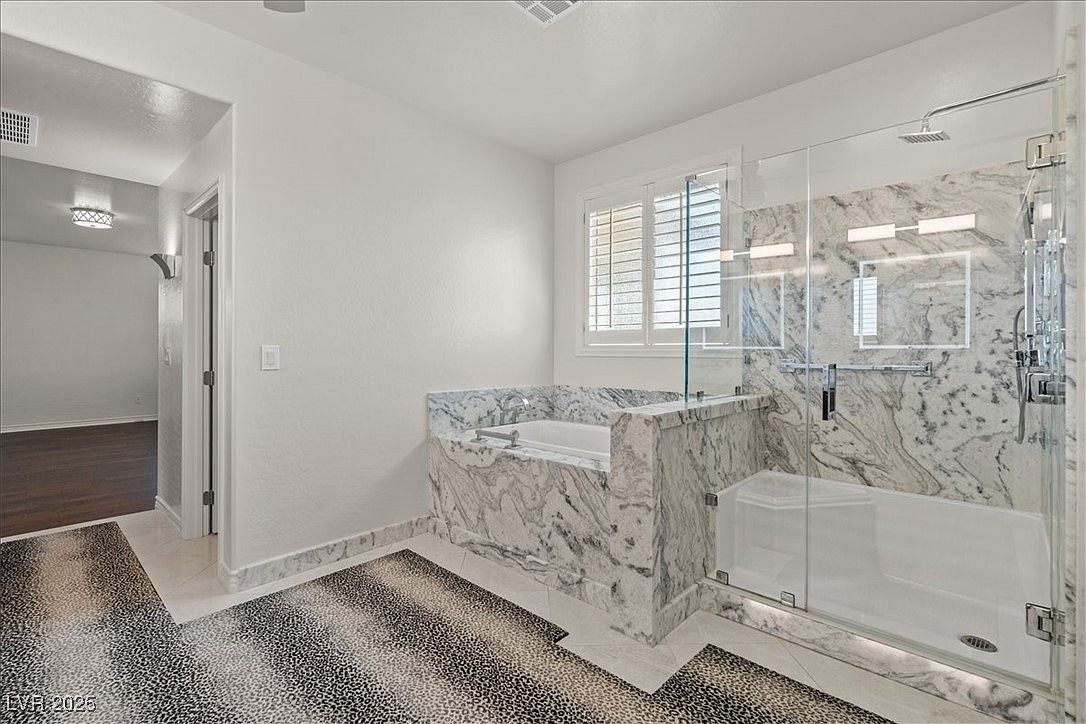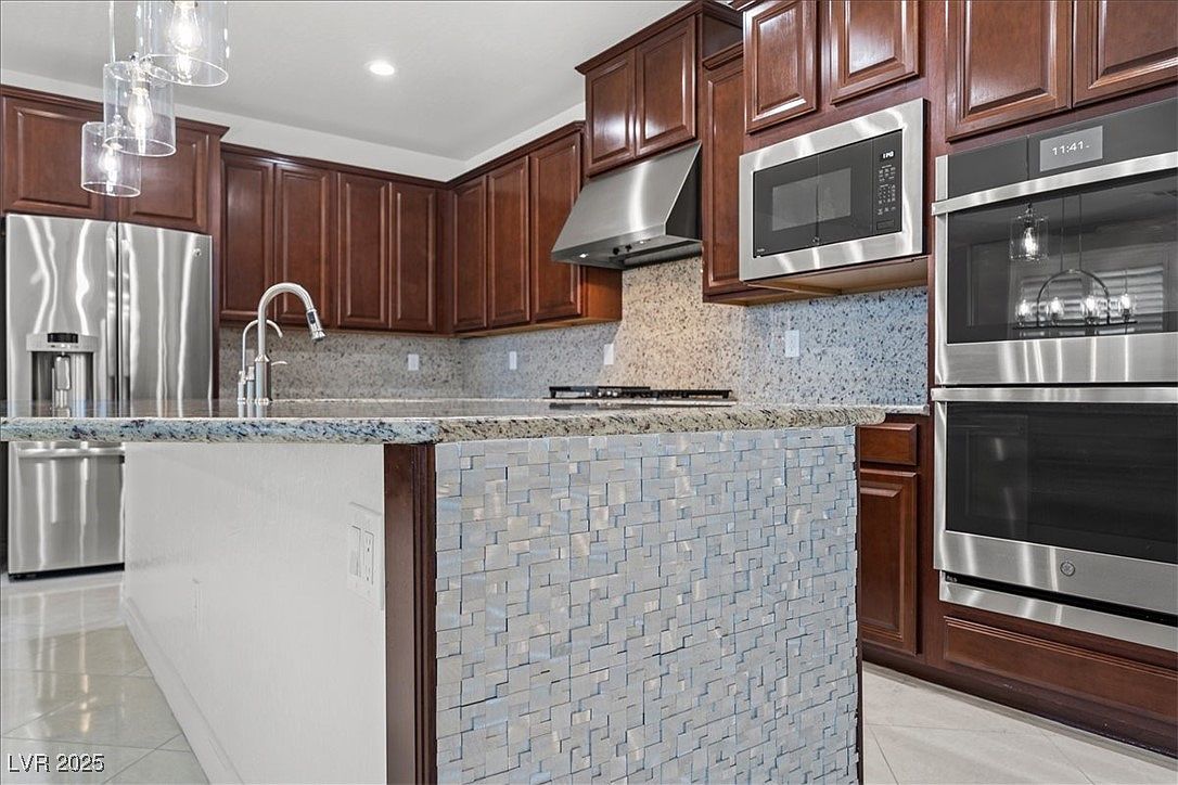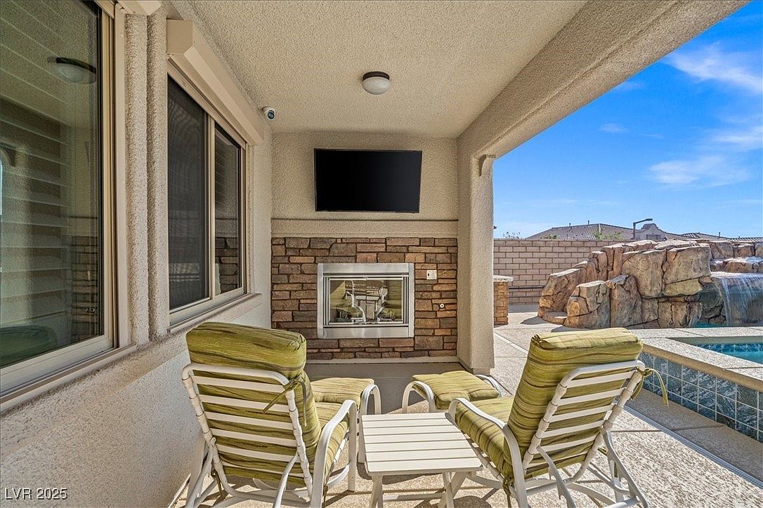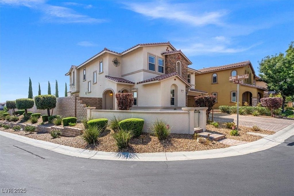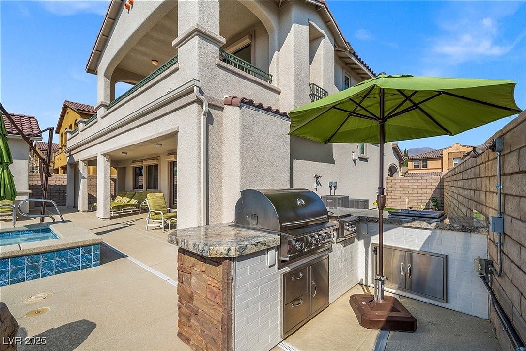 This beautifully designed home blends modern luxury with resort-style living in the desirable Paseo Village of Summerlin, Las Vegas, NV. The architectural style reflects a contemporary take on Southwestern design, featuring stucco walls, tiled roofing, and decorative stone elements that complement the arid landscaping outside. Built recently, this home showcases high-end finishes and remarkable attention to detail, including Italian Marble and Wood flooring, a stainless-steel wall by the fireplace, and elegant Silk & Mica wallpaper throughout the interior. The property is listed at $1,300,368 and sits on an oversized lot, offering ample outdoor space highlighted by a lush putting green, a custom outdoor BBQ kitchen, a cozy fireplace, and a covered patio perfect for entertaining. The pièce de résistance is the resort-style pool with a waterslide, cascading waterfall, and a grotto, complemented by stunning fire features that create a magical ambiance. In addition to the main residence, there is a versatile detached 1-bedroom, 1-bath casita complete with a Murphy bed, kitchen sink, private bathroom with a shower, washer/dryer, and a refrigerator. Inside the main home, the refined kitchen is equipped with a waterfall island, granite countertops, and high-end appliances, tailored for both casual and gourmet cooking. The master suite offers a spa-like experience with an all-marble shower, a relaxing soaking tub, and a custom walk-in closet. This home is zoned for the acclaimed Vassiliadis Elementary School and is conveniently located within walking distance to nearby parks, making it an ideal family-friendly community option. This property seamlessly combines luxurious indoor amenities with extraordinary outdoor leisure features, making it a unique find in Summerlin’s upscale real estate market.