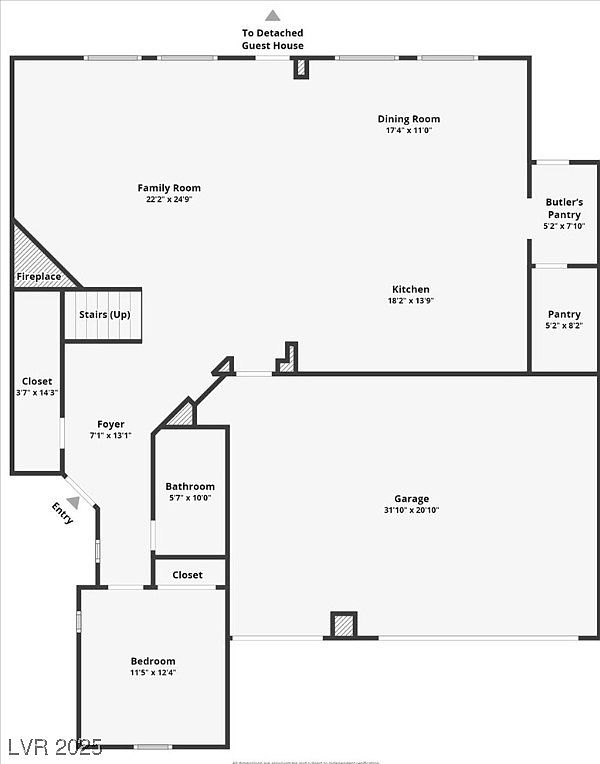 This polished first-floor layout highlights a spacious family room paired with a fireplace, positioned near the entry foyer. The foyer leads directly to a bedroom with an adjacent bathroom, offering convenient privacy. The open-concept design flows seamlessly from the kitchen to the dining room, emphasized by a butler’s pantry and separate pantry for organized storage. The large garage, accessible from within, completes the functional arrangement. Rooms are defined with clear, clean lines and classic proportions, optimizing both comfort and efficiency in a modern home.