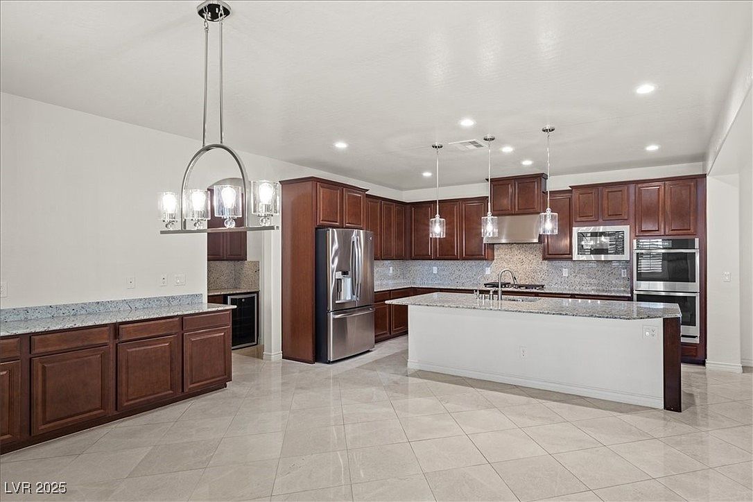 This kitchen features a modern, open layout accented by warm dark wood cabinetry that extends to the ceiling, creating ample storage space. The countertops and backsplash showcase a polished granite surface in subtle grey tones, complementing the soft beige floor tiles arranged diagonally for an elegant touch. Stainless steel appliances, including a double oven, microwave, and French-door refrigerator, add sleekness and functionality. A large central island with an undermount sink and pendant lighting overhead enhances both workspace and ambiance. Recessed ceiling lights provide bright, even illumination throughout the room.