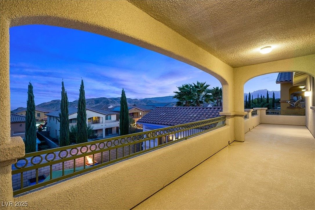 This expansive covered balcony features a textured stucco finish on walls and ceiling, painted in warm beige tones that complement the home’s Mediterranean aesthetic. The open arches frame views of neighboring homes and tall cypress trees, creating a tranquil outdoor retreat. The wrought iron railing with circular detailing adds a subtle decorative touch while ensuring safety without obstructing the vista. Recessed lighting fixtures illuminate the space for evening enjoyment. The balcony’s generous size invites multiple seating arrangements, perfect for relaxing or entertaining while soaking in scenic views of distant mountains and lush greenery.