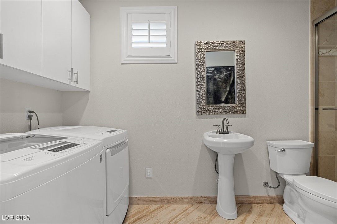 This practical and clean space combines a laundry area with a small bathroom, showcasing efficient use of space. The white washer and dryer sit side by side beneath sleek white cabinetry, offering ample storage with modern silver hardware. A modest window with plantation shutters allows natural light to brighten the room. The bathroom section features a white pedestal sink under an elegant somewhat textured rectangular mirror with a metallic frame, paired with a traditional white toilet. Neutral-toned marble-look flooring ties the areas together, while a glass-enclosed shower suggests further bath amenities beyond the frame. The room is bright, simple, and functional with a subtle touch of sophistication.