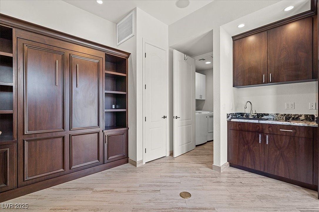 This space combines a functional laundry area with rich wooden cabinetry for ample storage. The muted beige tile flooring complements the dark wood tones of the elegant built-in cabinets and shelving along one wall. The cabinetry features sleek, modern silver handles, echoing the minimalist yet refined aesthetic. Opposite the shelving, upper and lower cabinets flank a countertop with a stylish black-and-white granite surface, integrated with a practical stainless steel sink. Through a doorway, the white washer and dryer stand in a separate laundry nook, emphasizing an organized and efficient layout within a neutral, clean palette.