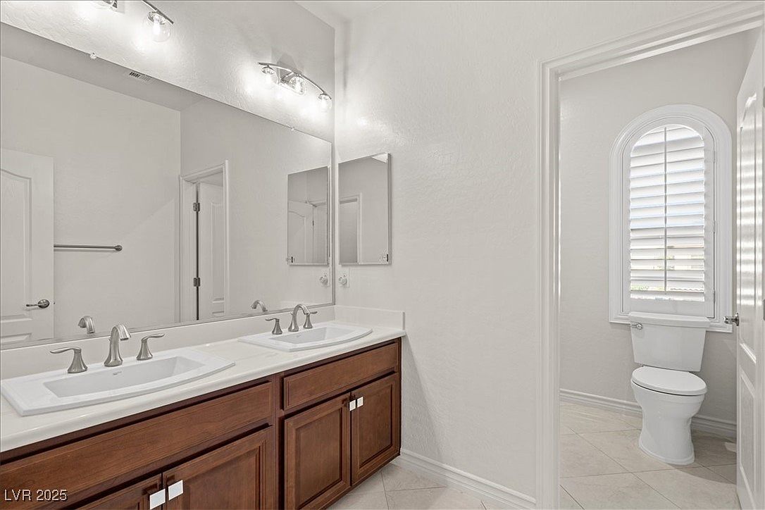 This bathroom features a clean, polished design centered around a double-sink vanity with dark wood cabinetry contrasted against crisp white countertops. Above the vanity, a large mirror spans the width, reflecting ample light from the two modern brushed metal light fixtures. The layout cleverly separates the toilet area by positioning it in a recessed alcove visible through an open doorway, complemented by a tall, arched window with white plantation shutters that allow natural light to softly diffuse into the space. The neutral color palette of whites and muted earth tones creates a fresh, airy atmosphere conducive to relaxation and functionality.