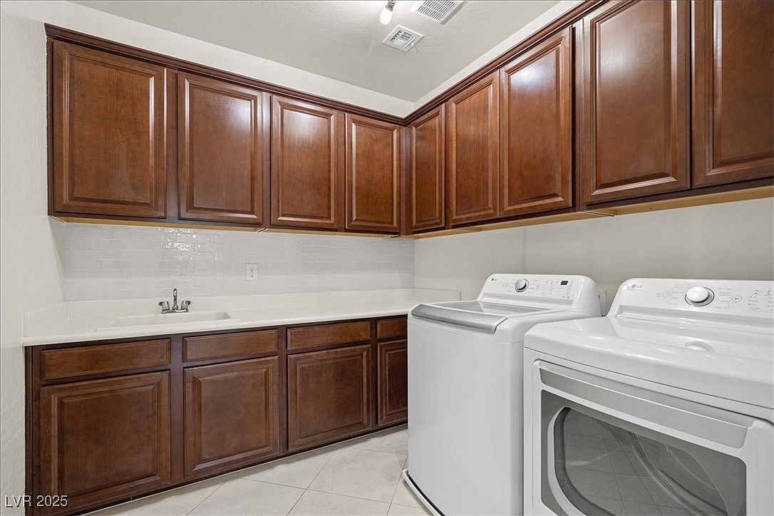 This laundry area features a practical, clean layout with extensive cabinetry for ample storage. Rich, dark wood cabinets line both the upper and lower walls, contrasting nicely against the sleek white countertops and light-colored tile flooring. The white backsplash tiles add a subtle, glossy texture behind the countertop and sink area, enhancing the room’s brightness. The space includes modern white washer and dryer units that complement the overall clean and polished look. The neutral color palette and efficient use of storage suggest a functional yet aesthetically pleasing utility space.