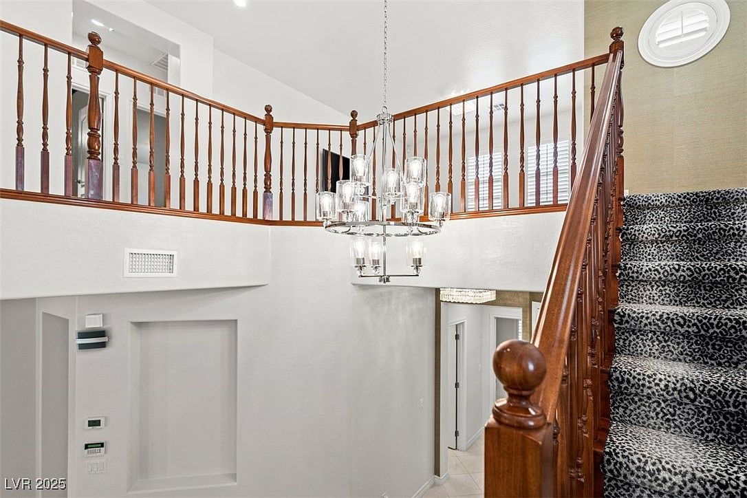 This area highlights a staircase leading to an upper landing surrounded by a wooden spindle railing featuring a classic, polished finish. The staircase is carpeted in a bold grey and black leopard-print pattern, adding a distinctive touch of personality and contrast against the white walls and neutral floors. A modern chandelier with multiple glass candle-like lights hangs centrally, casting an elegant glow throughout the double-height space. Natural light filters in through a small round window on the adjacent wall. The landing overlooks the lower floor, creating an open and airy atmosphere with a blend of traditional and contemporary design elements.