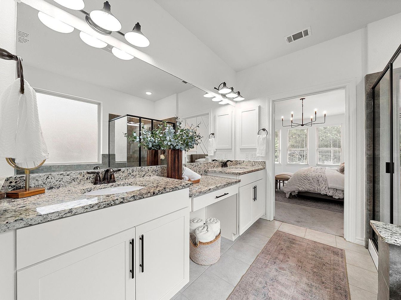 This spacious master bathroom features a dual vanity with granite countertops in earth tones complemented by white cabinetry. The cabinetry has sleek black handles creating a subtle contrast against the light backdrop. A large mirror stretches the length of the vanity, enhancing the open feel and reflecting ample natural light from the frosted window near the shower. Above, modern black light fixtures with shades illuminate the space warmly. The floor is tiled in soft gray, coordinated with a beige patterned runner. To the right, a glass-enclosed shower in dark tiles anchors the space. The doorway leads to a bedroom with plush carpeting and contemporary furnishings, creating a seamless flow between rooms.
