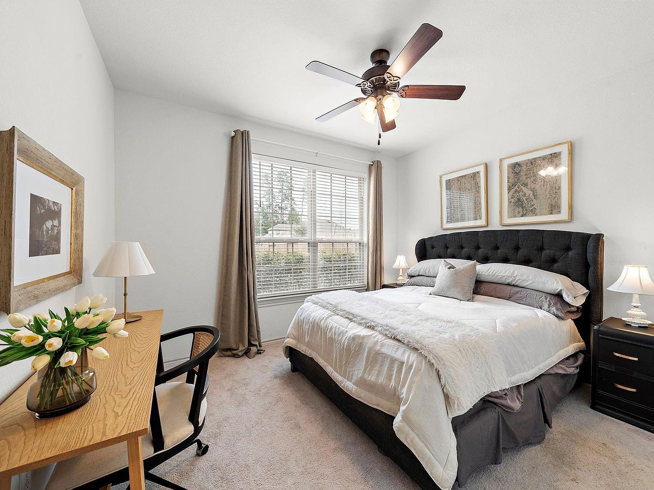 This bedroom features a soft, neutral color palette with light grey walls and beige carpet fostering a calm ambiance. The centerpiece is a large, tufted, black upholstered bed with plush bedding layered in white and grey tones, complemented by a fluffy throw blanket. Symmetrically placed on either side are matching black nightstands with classic white lamps. Natural light floods the room through a wide window dressed with taupe floor-length curtains. A compact wooden desk with a vase of white tulips and a modern black chair occupy one corner, adding a functional yet elegant touch. A ceiling fan with wooden blades completes the room’s blend of comfort and style.